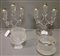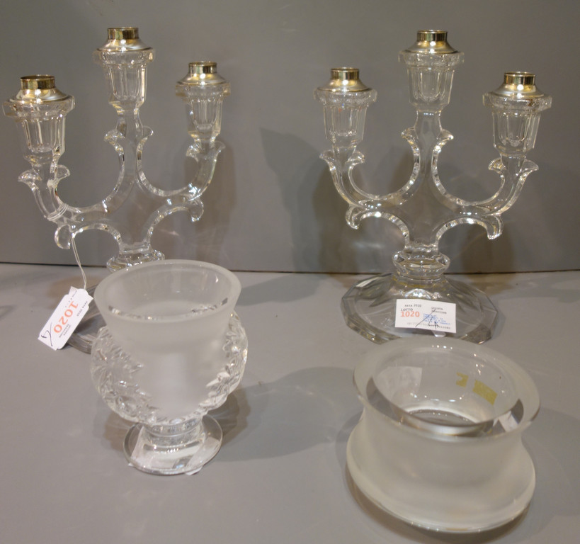 Coppia di candelabri in cristallo a tre luci e due vasetti in cristallo