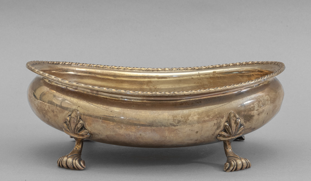 Centrotavola ovale in argento con piedini, cordonatura nel bordo