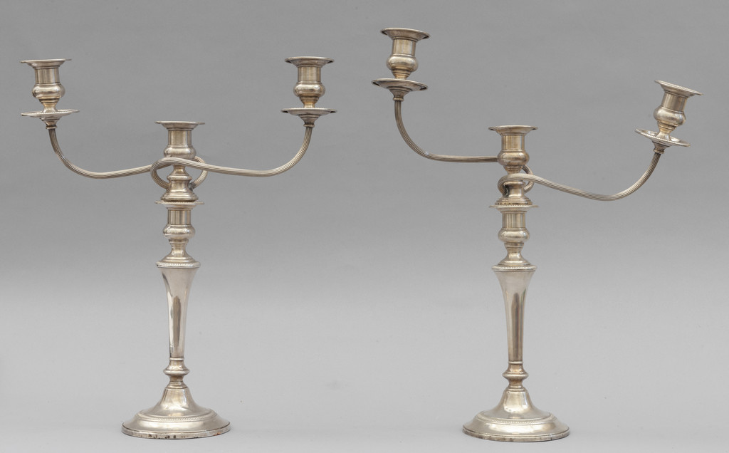 Coppia di candelieri a tre luci in argento, Inghilterra sec.XX