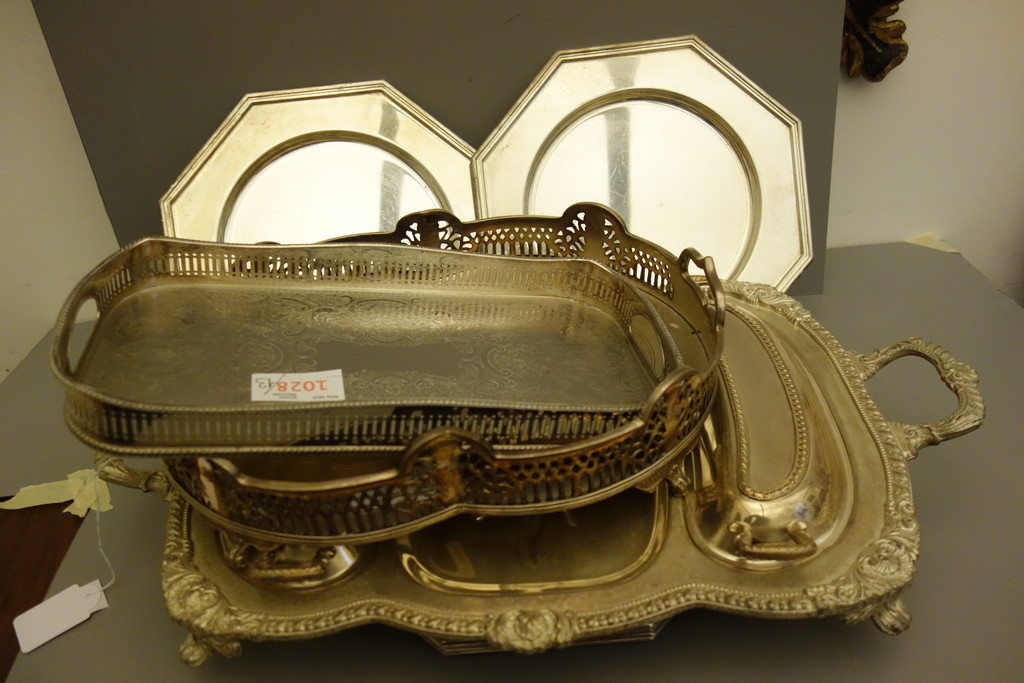 Tre vassoi in metallo argentato e dieci sottopiatti in metallo