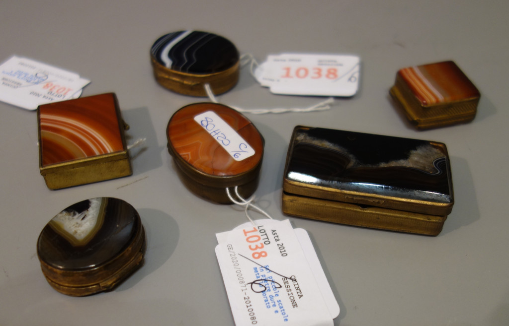 Sei piccole scatole in pietre dure e metallo dorato