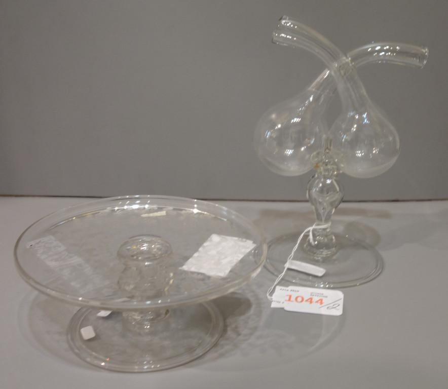 Alzatina in vetro di Murano (diam.cm.16xh.7) e doppia ampolla in vetro di Murano (h.cm.21)