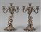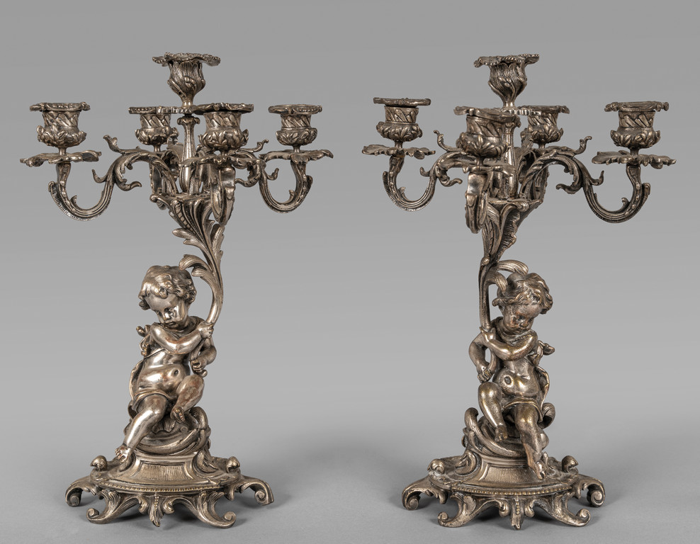 Coppia di candelabri in bronzo argentato raffiguranti due putti che sorreggono un braccio a cinque luci, fine sec.XIX