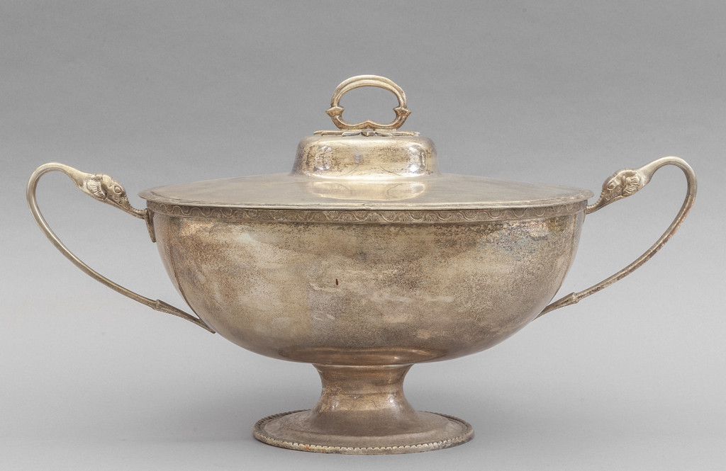 Grande zuppiera in metallo argentato in stile Impero, prese a forma di elefante