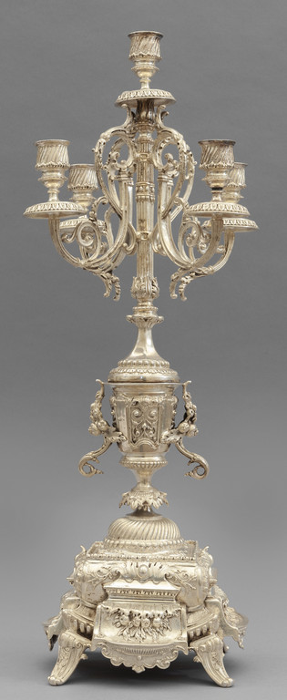 Grande candelabro a cinque luci in argento finemente cesellato