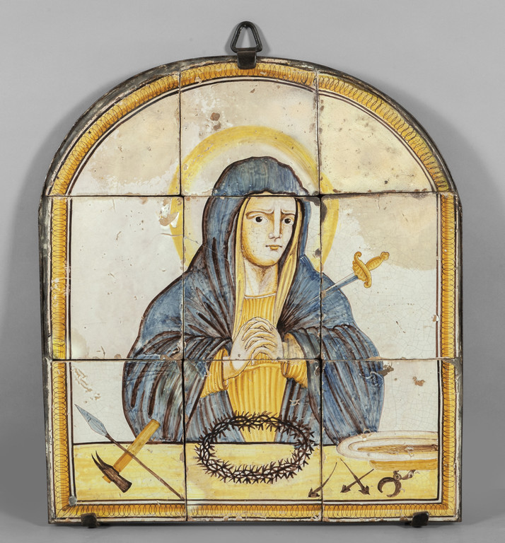 Grande placca in ceramica policroma raffigurante Madonna della Spada, Italia Meridionale sec.XVIII