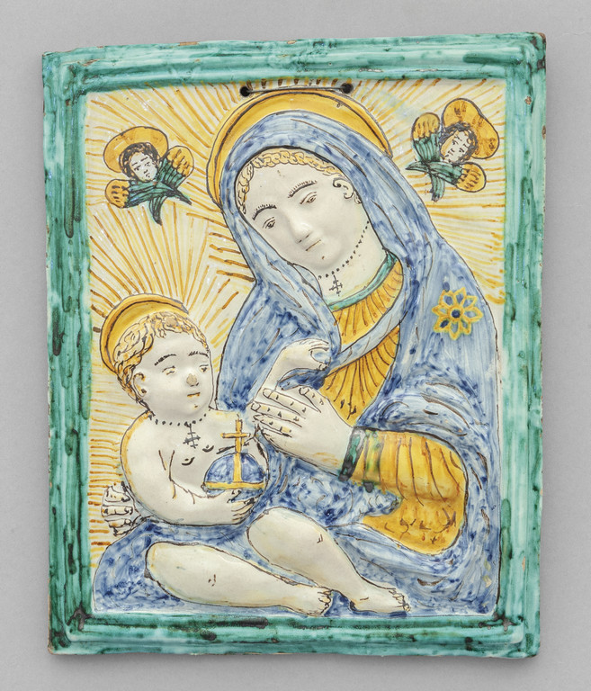 Placca in maiolica policroma raffigurante la Madonna con Bambino, Italia Centrale sec.XVIII