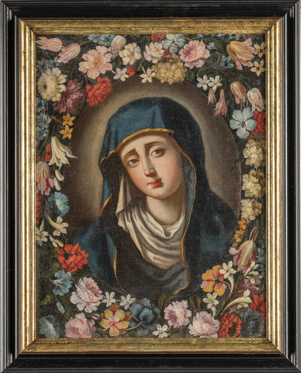 Scuola piemontese sec.XVIII "Madonna contornata da ghirlanda di fiori" olio
