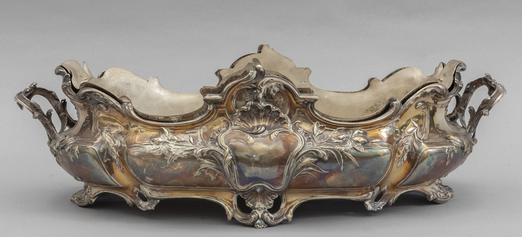 Grande fioriera Liberty in argento finemente sbalzato, all'interno contenitore in metallo argentato, fine sec.XIX