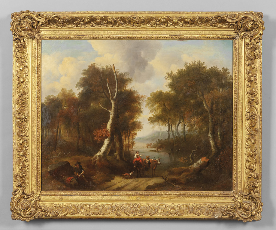 Scuola fiamminga sec.XVIII "Paesaggio con figure e armenti" olio, cornice dorata