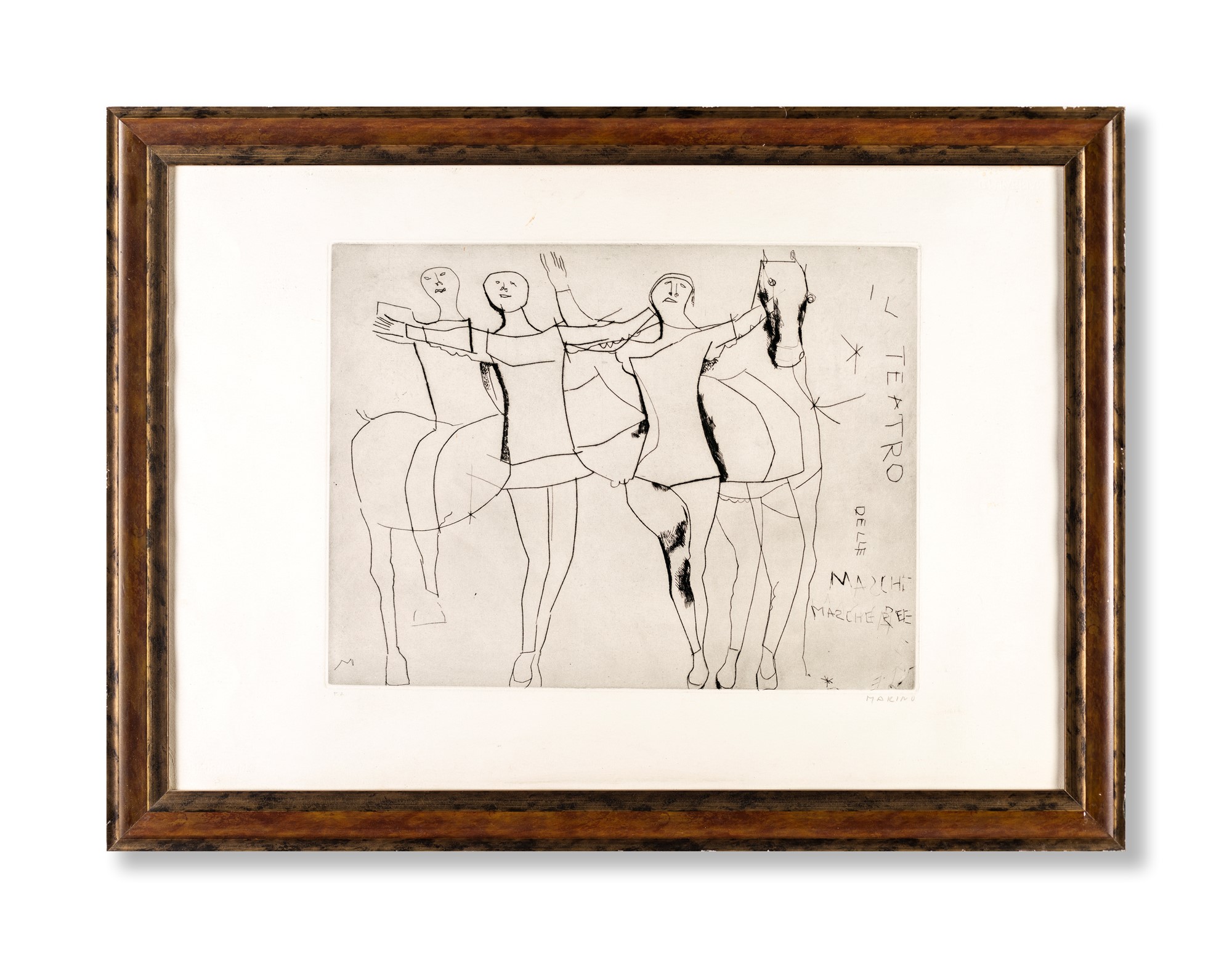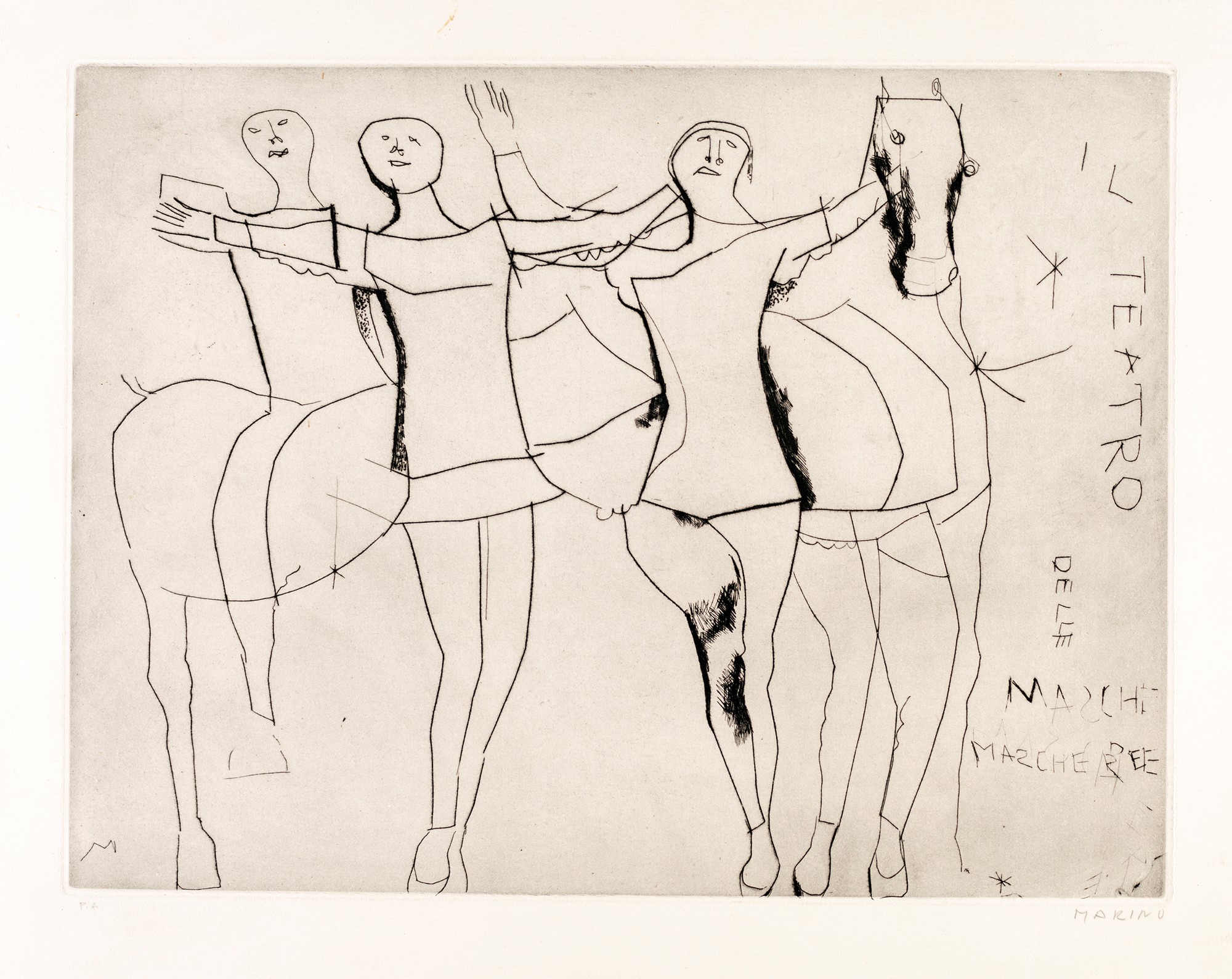 Marino Marini - Il teatro delle maschere - Firma e numerazione sul fronte "Marino , P.a.". Monogramma e titolo su lastra - Acquaforte - 48,5x64,5 (foglio 70x100). -
