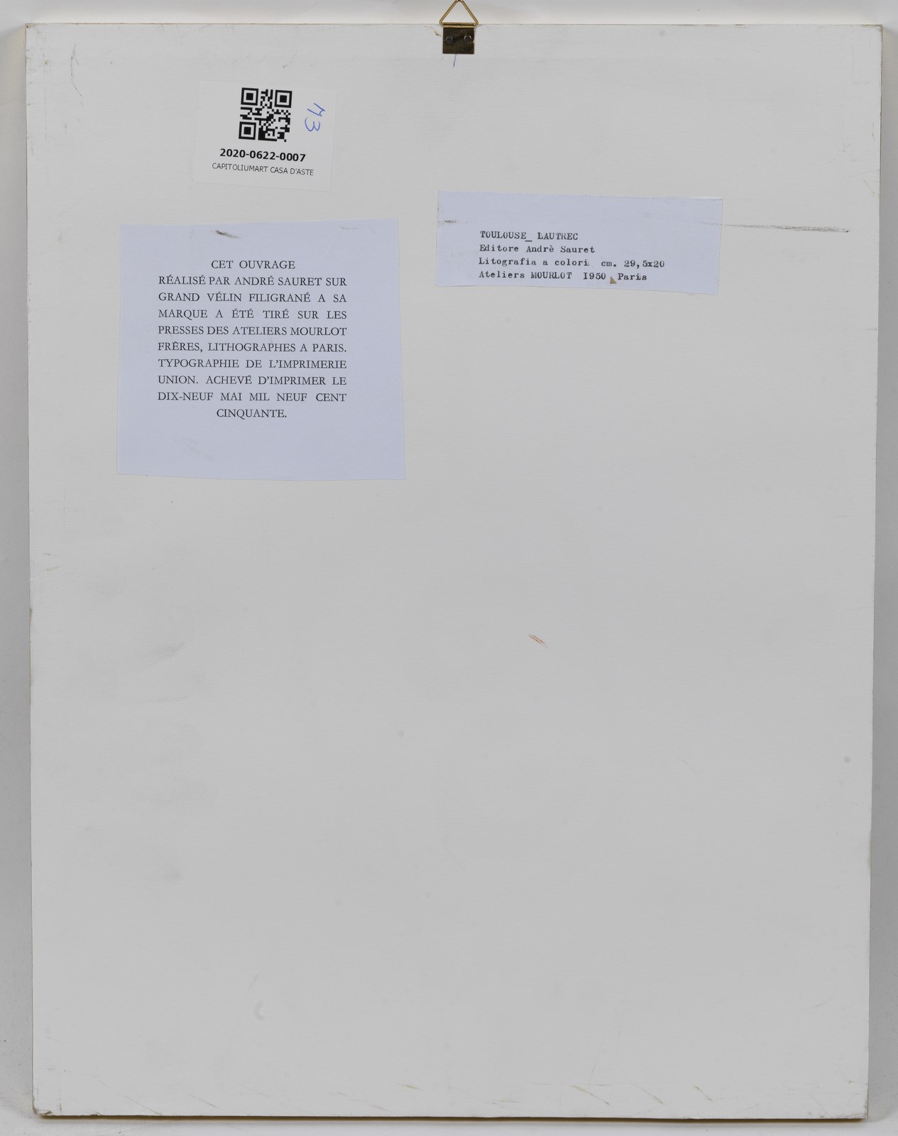 DE TOULOUSE-LAUTREC HENRI (1864 - 1901) D'apres. Aristide Bruant dans son cabaret. 1950. Litografia a colori. Cm 20,00 x 29,50. Edizioni André Sauret, Atelier Mourlot , Parigi 1950. Firma in lastra e monogramma in basso a sinistra. . Cornice presente
