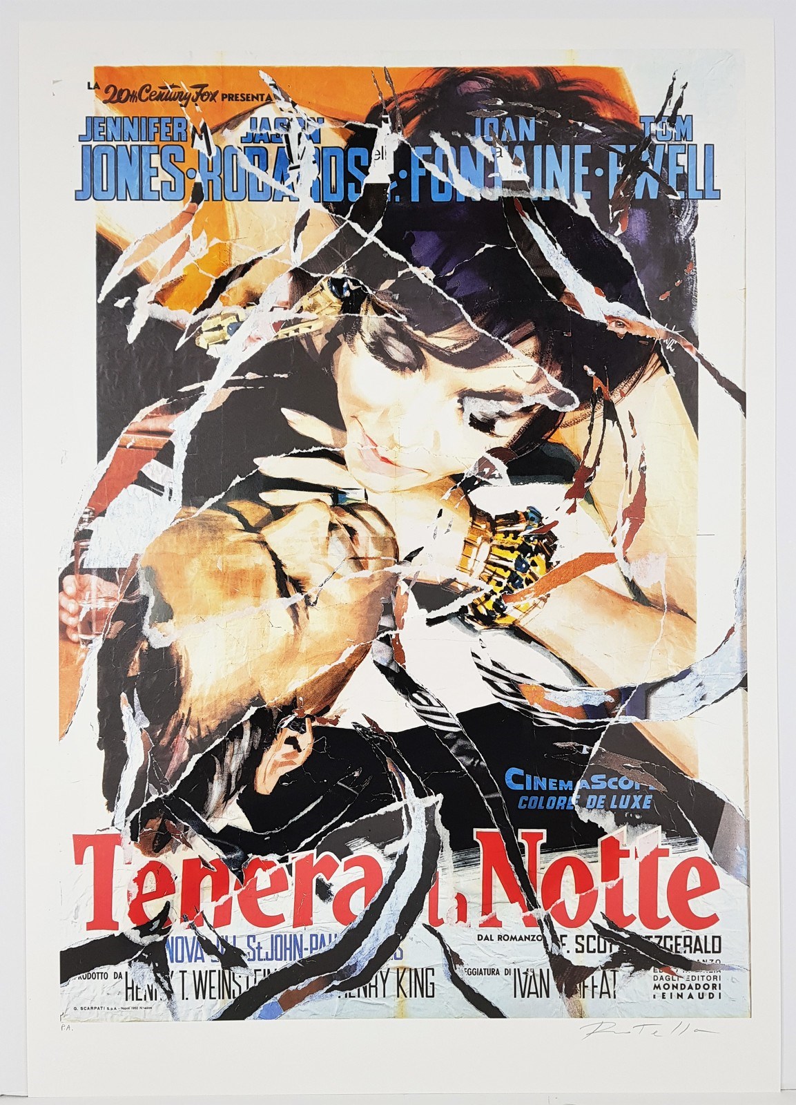 ROTELLA MIMMO (1918 - 2006) Tenera La notte. Litodecollage. Cm 100,00 x 70,00. P.A. Tiratura e firma a matita in basso. Timbro a secco Fondazione Rotella, Milano in basso a sinistra. Pubblicazione: Mimmo Rotella - multiples décollages a cura di Elena Pontiggia, Silvana Editoriale, 2005, pag.70.