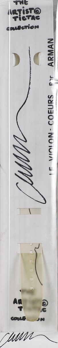 ARMAN FERNANDEZ (1928 - 2005) Le Violon Coeurs. 1994. Orologio. Cm 3,50 x 23,00. Orologio da polso in plastica, edizioni Artistictac Art Edition. Firma autografa incisa a graffio sulla parte superiore. Opera conservata nella sua confezione originale.