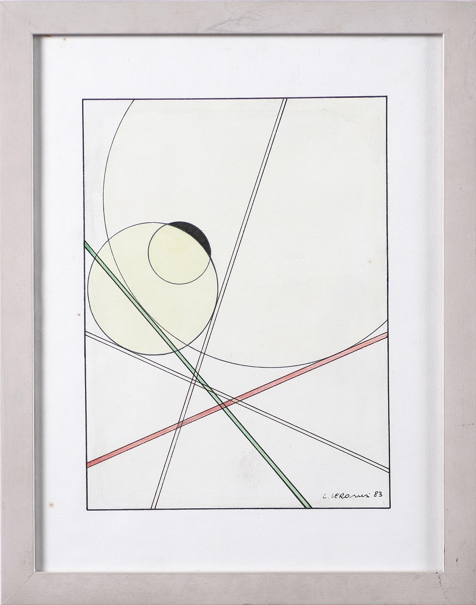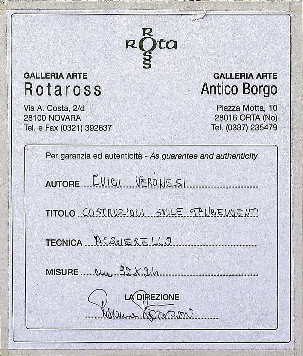 VERONESI LUIGI (1908 - 1998) Senza titolo. 1987. Acquarello su carta su tela. Cm 18,00 x 24,50. Firma e data in basso a destra. Leggere macchie di umidità. Al retro cartiglio della Galleria D'Arte Rotaross, Orta (NO), per autenticità e provenienza. Autentica su fotografia a cura della Galleria d'arte Rotaross con firma e data dell'artista. . Cornice presente