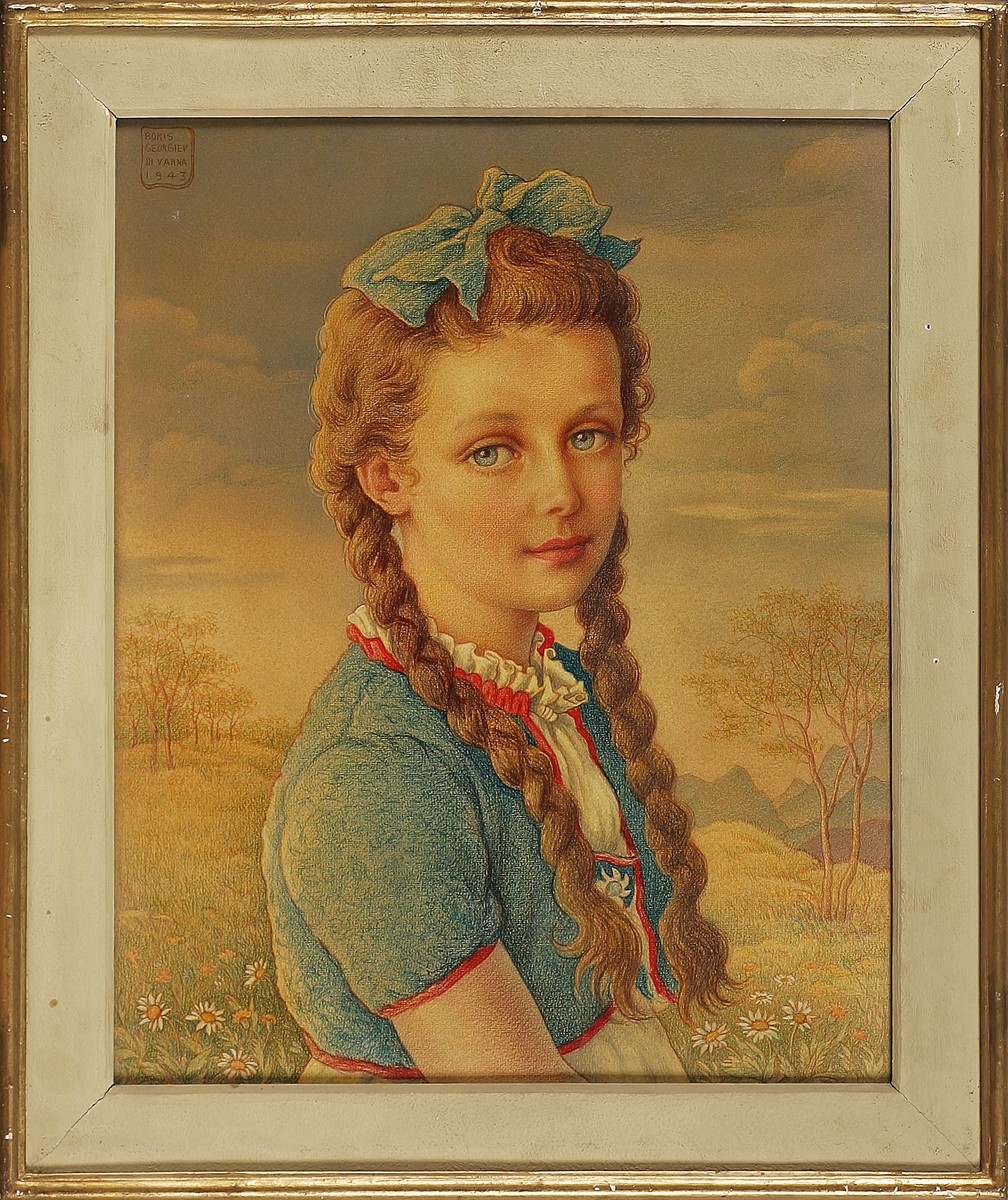 BORIS GEORGIEV (1888 - 1962) Ritratto di Nella. 1943. Olio e tempera su cartone pressato. Cm 40,00 x 50,00. Firma e data in alto a sinistra. Cornice presente