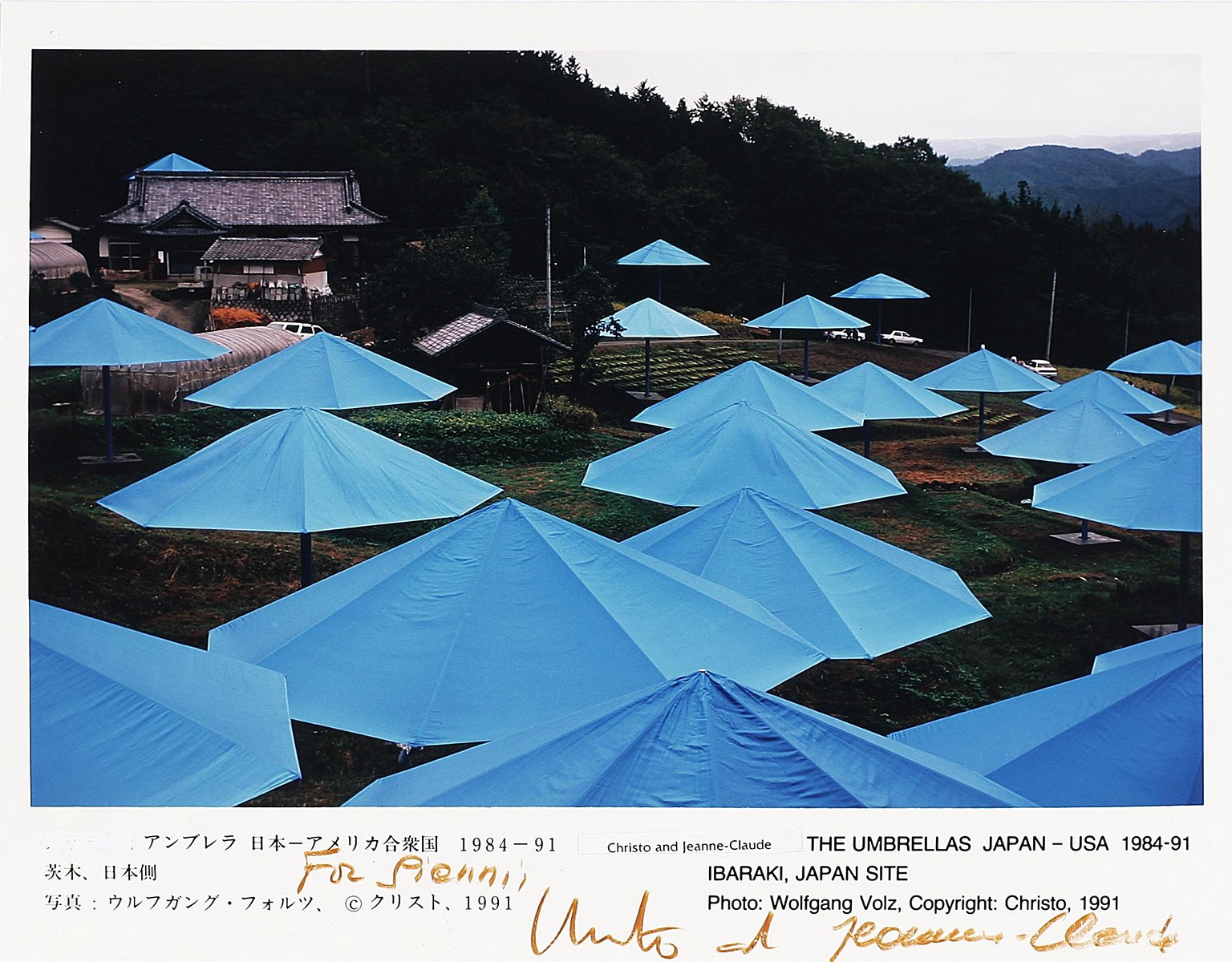 CHRISTO' (n. 1935) JEANNE-CLAUDE (1935 - 2009) The umbrellas. Fotografia. Cm 25,00 x 20,00. Firma e dedica a pennarello, Frammento del tessuto dell'installazione incollato sul fronte.