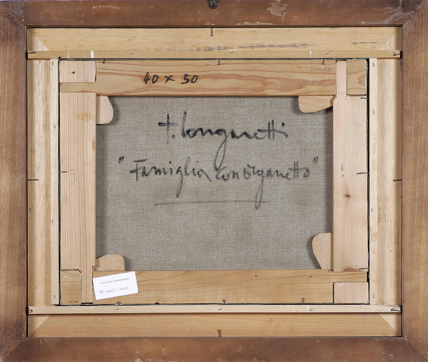 LONGARETTI TRENTO (n. 1916) Famiglia con organetto. Olio su tela . Cm 50,00 x 40,00. Firma in basso a sinistra. Firma e titolo al retro. Opera archiviata presso l'inventario delle opere a olio di Trento Longaretti a cura dell' Associazione Longaretti, Bergamo, come da documentazione fotografica allegata riportante numero d'archivio. Cornice presente