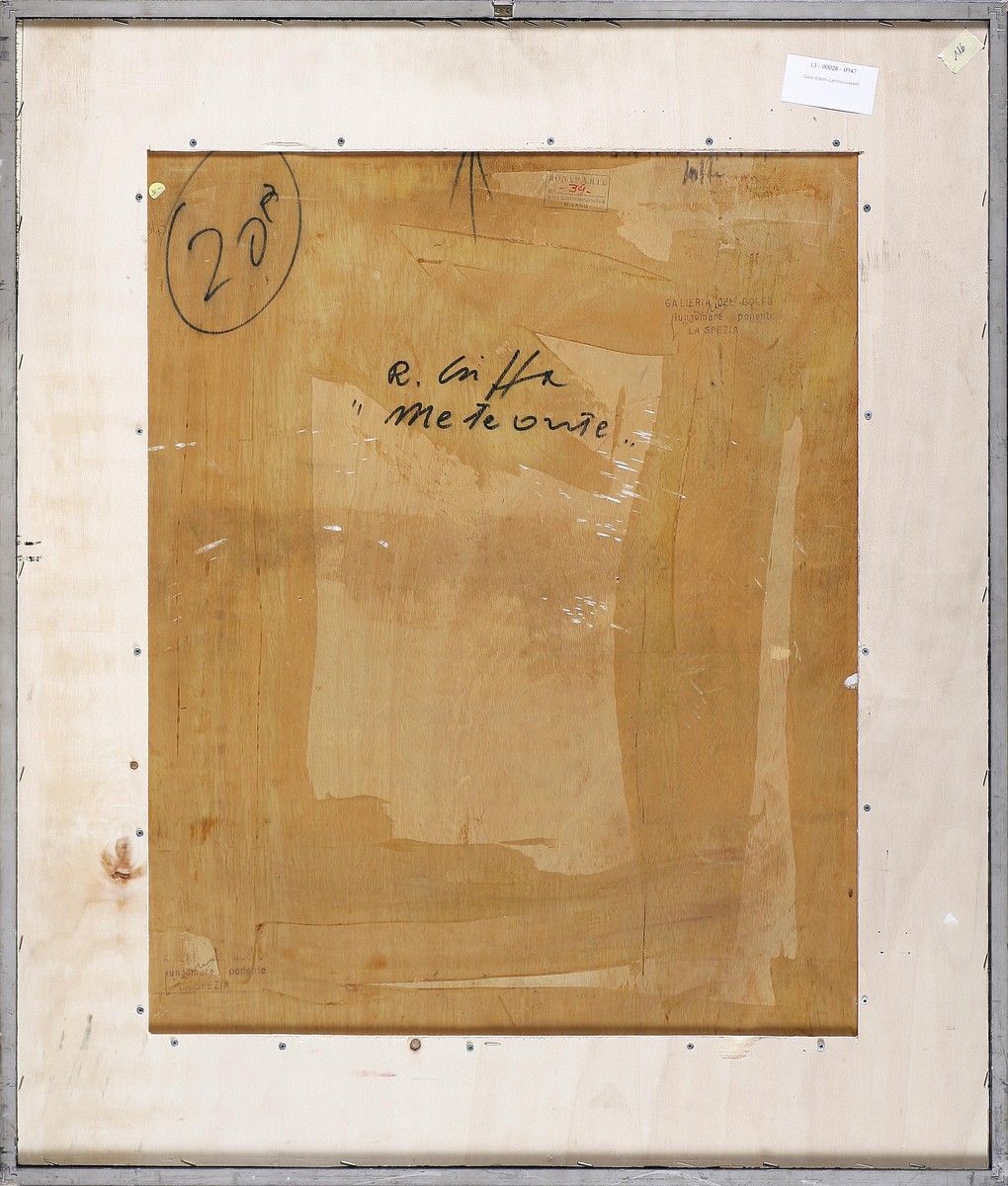 CRIPPA ROBERTO (1921 - 1972) Meteorite. 1970. Tecnica mista su tavola. Cm 58,00 x 72,00. Al retro firma e titolo; timbro della Galleria Bonaparte, Milano; timbro della Galleria Del Golfo, La Spezia. Autentica su fotografia a cura di Roberto Crippa Jr. Cornice presente