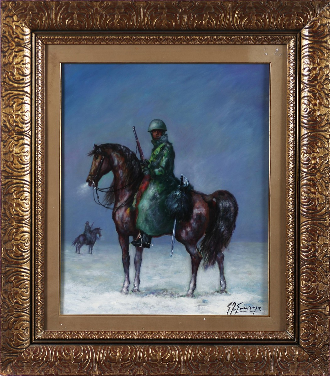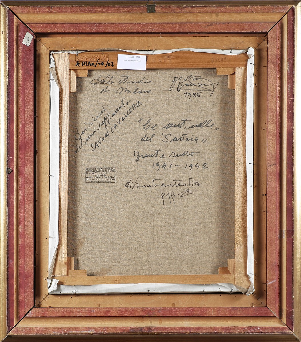 GONZAGA GIOVAN FRANCESCO (1921 - 2007) Le sentinelle di Savoia. Fronte Russo 1941-1942. 1985. Olio su tela . Cm 50,00 x 60,00. Firma in basso a destra. Al retro anno, titolo e firma per autentica; timbro della Galleria del Salotto, Milano. Opera archiviata presso l'Archivio Fotografico Generale di Giovan Francesco Gonzaga a cura della Galleria Del Salotto, Milano, come documentazione fotografica allegata all'opera riportante il relativo numero d'inventario. Cornice presente