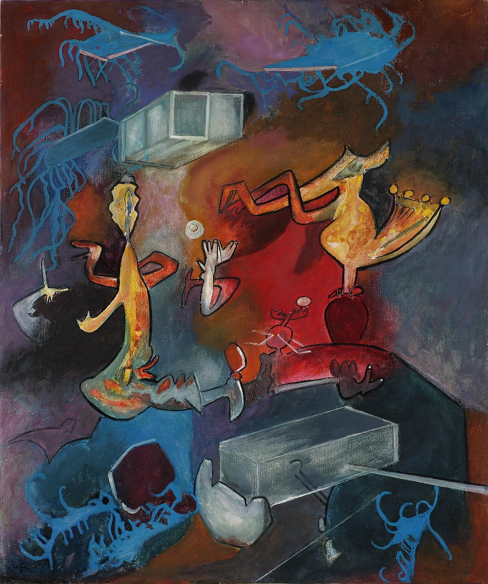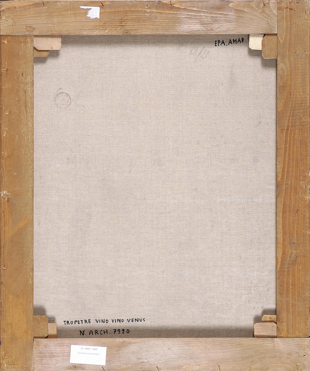 MATTA SEBASTIAN (1911 - 2002) Tropete Vino Vino Venus. 1979. Olio su tela . Cm 82,00 x 74,00. Firma in basso a sinistra. Al retro titolo e numero di archiviazione. Opera archiviata presso l'Archives de L'Oeuvre de Matta, a cura di Germana Ferrari-Matta, Viterbo, come da documentazione fotografica allegata all'opera riportante il relativo numero d'inventario. Cornice presente