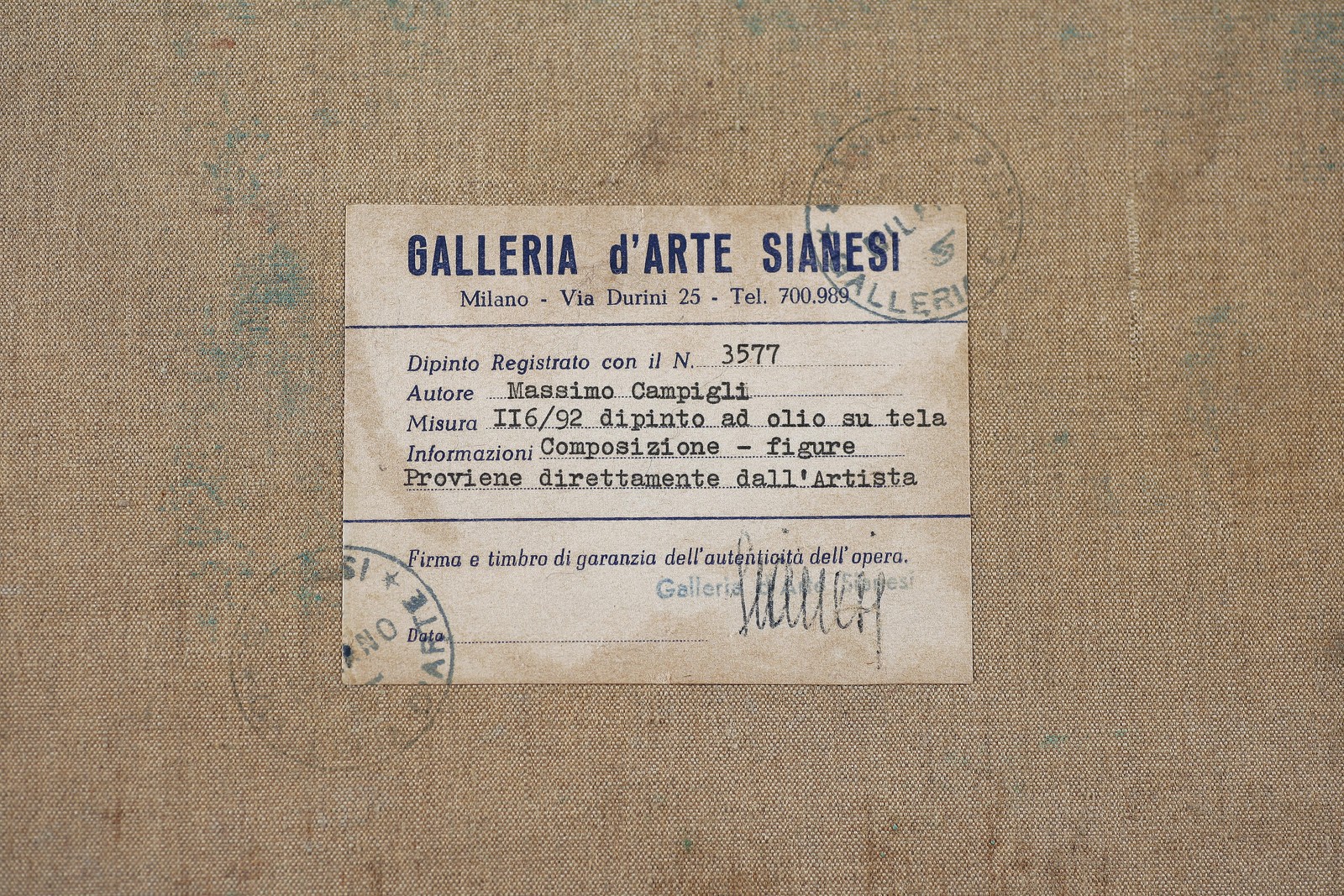 CAMPIGLI MASSIMO (1895 - 1971) Composizione - figure. 1961. Olio su tela . Cm 116,00 x 90,00. Firma e data in basso a destra. Al retro presenta il cartiglio della Galleria d'arte Sianesi, Milano. Opera archiviata presso l'Archivio Massimo Campigli, Saint Tropez, Francia. Cornice presente