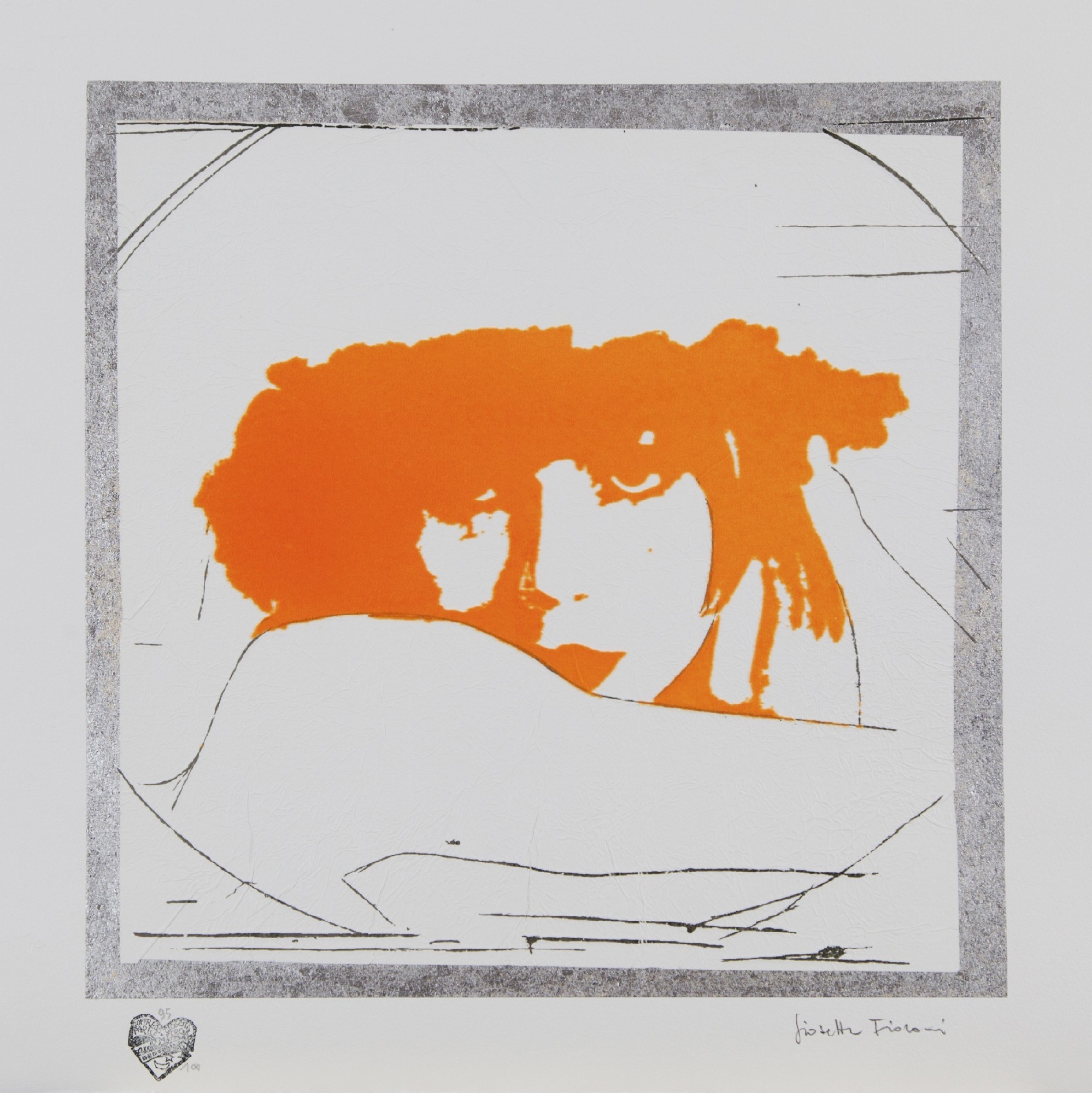 Serigrafia materica con pigmento arancio luminoso con floccaggio.