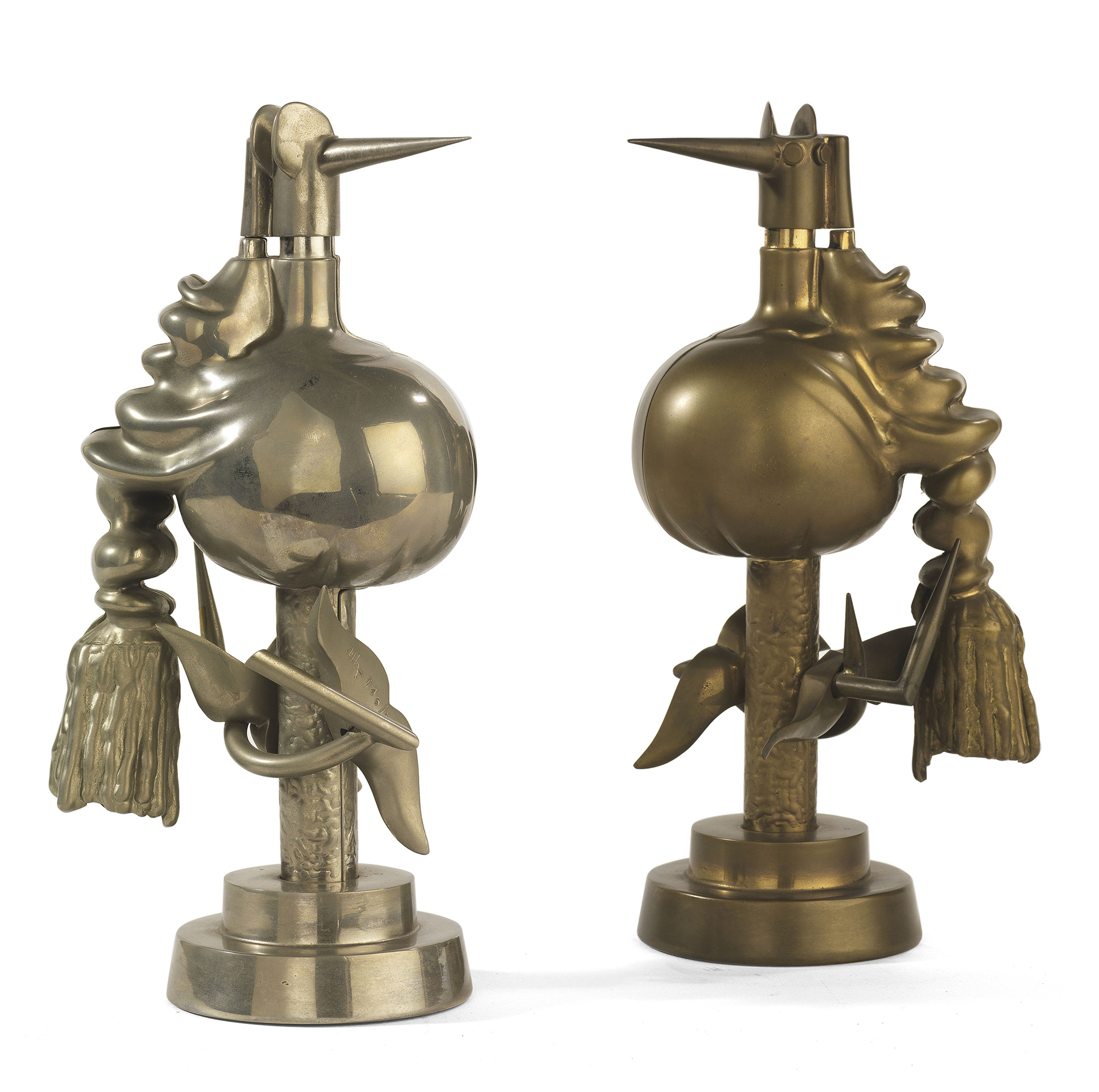 Due sculture in ottone lucidato e cromato, es. 146/500A e es. 146/500B, cm. 26 h. ognuna
