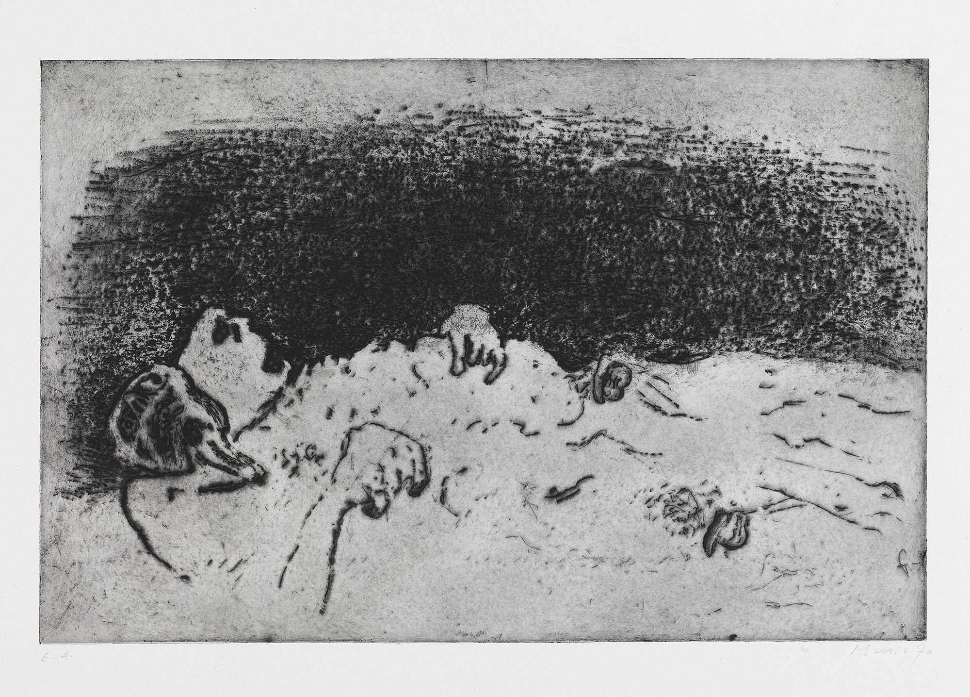 Firma e data a matita sul margine in basso a destra: Music 70, tiratura in basso a sinistra: E.A.