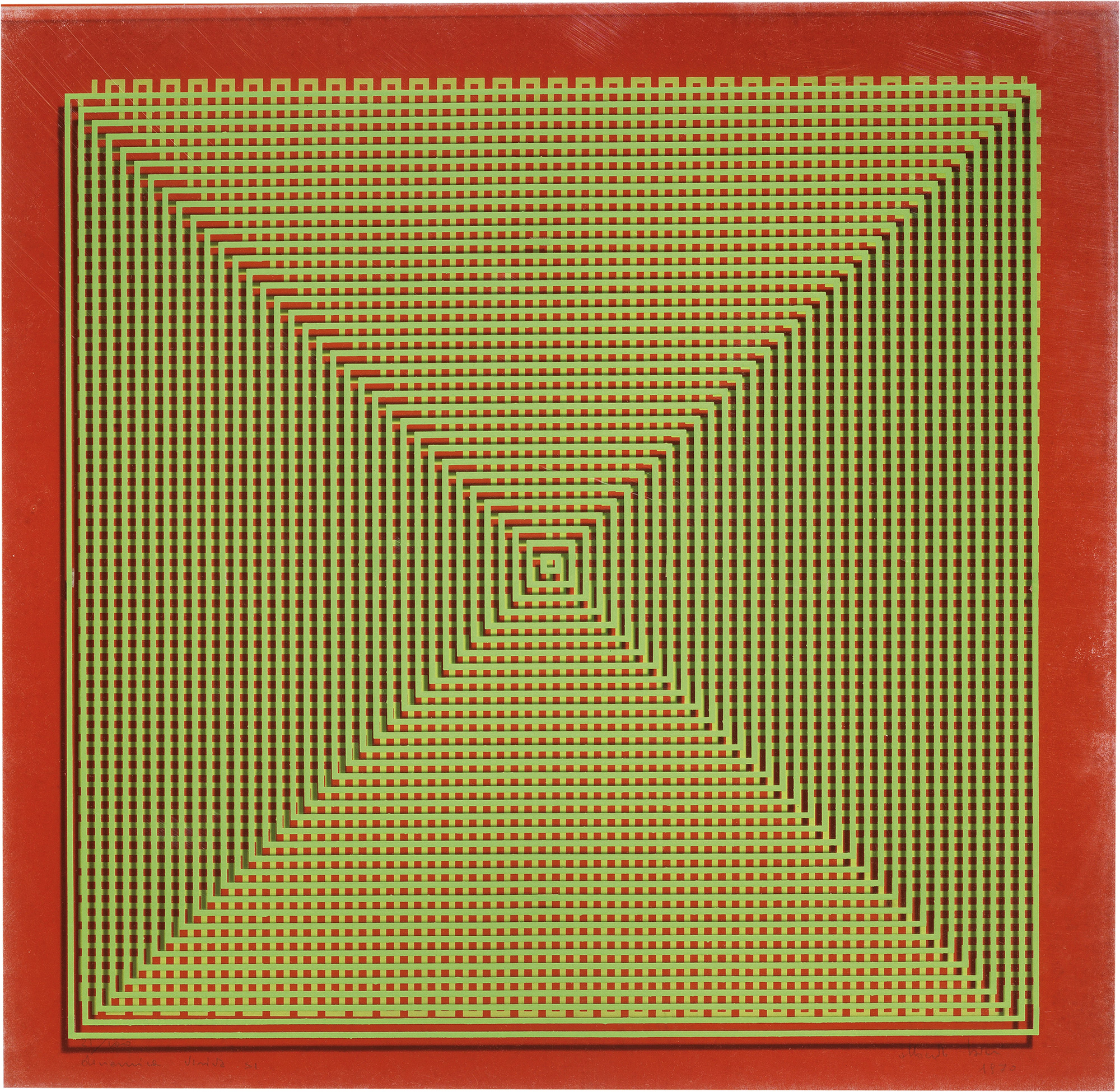 Alberto Biasi, Progetto S1, dinamica visiva in verde su fondo rosso, 1970