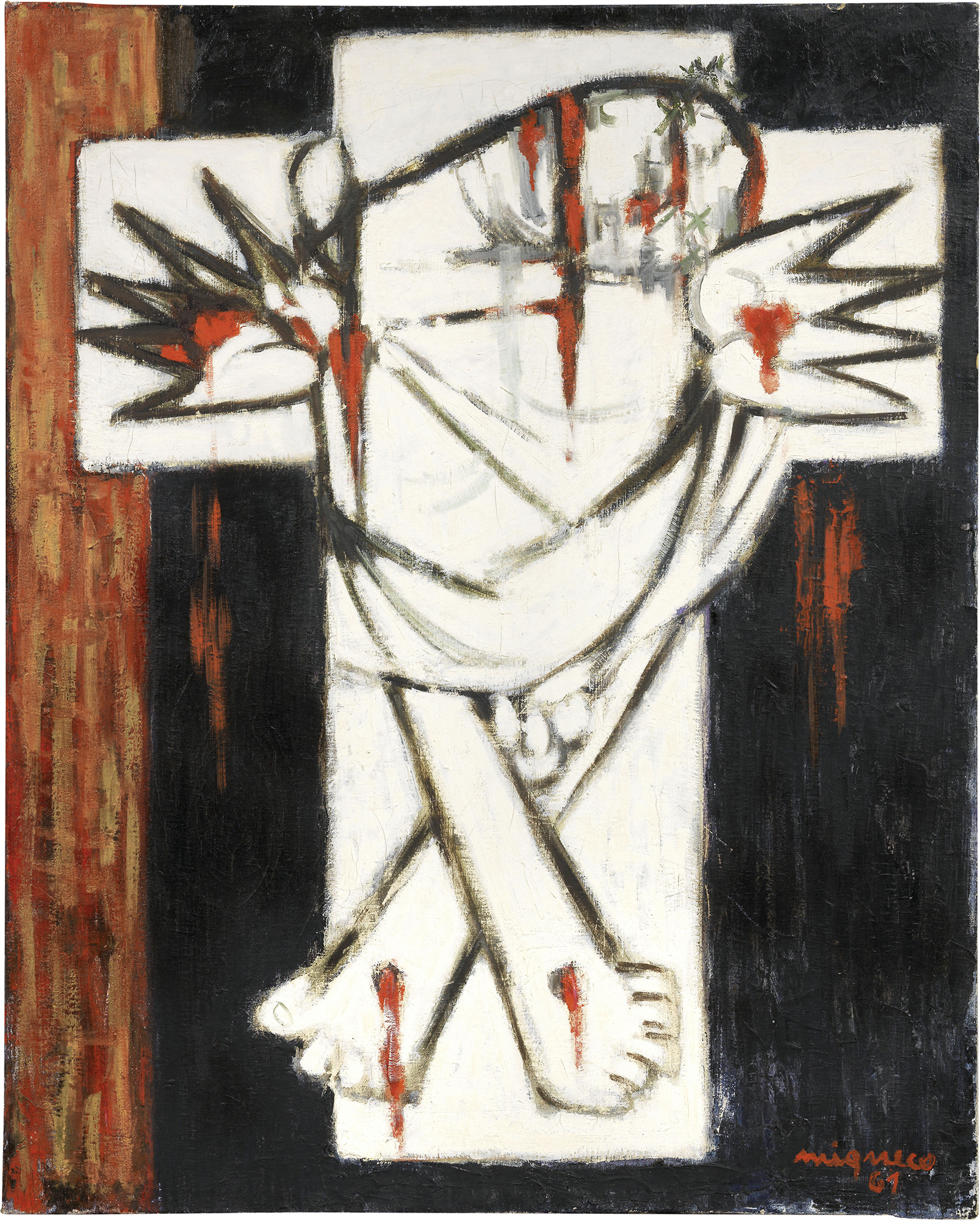 Firma e data in basso a destra: Migneco / 61; firma, data e titolo al verso sulla tela: Migneco / 61 / "Crocefissione".