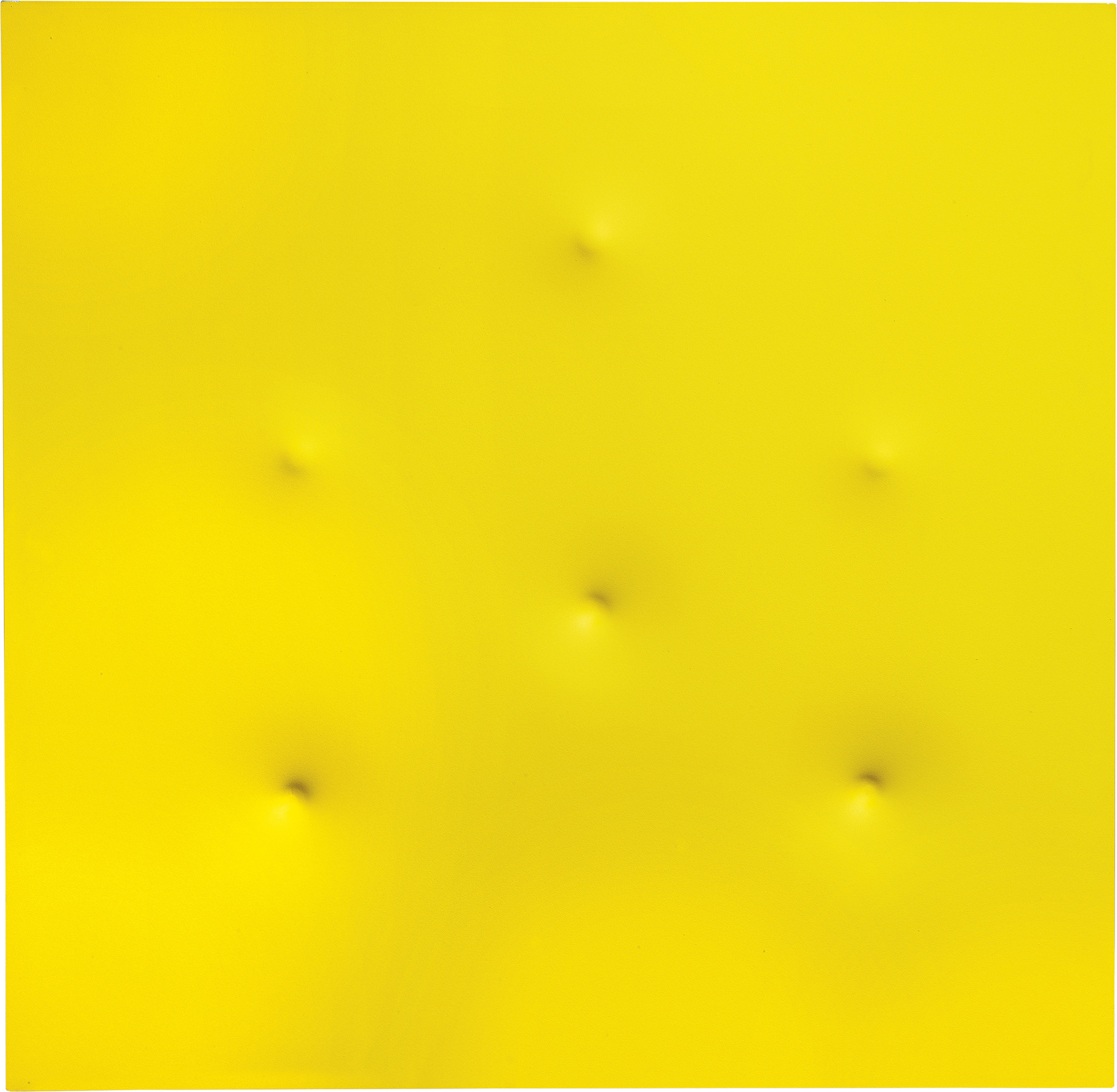 Titolo, firma e numero d'archivio al verso: N. 6 spari fucile cal. 12 / lastra in alluminio / Brescianini / Angelo / Arch. N. / BA00525102: etichetta Catalogo Ragionato / delle Opere / di Angelo Brescianini / © a cura di Antonio Falbo, con n. repertorio BA00525102 e due timbri dell'artista: etichetta e timbro Lattuada Studio, Milano, con n. 3842; sul telaio: timbro dell'artista