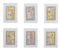 Sei disegni a matita colorata e penna su carta, cm. 16,5x11 ca., ognuno
