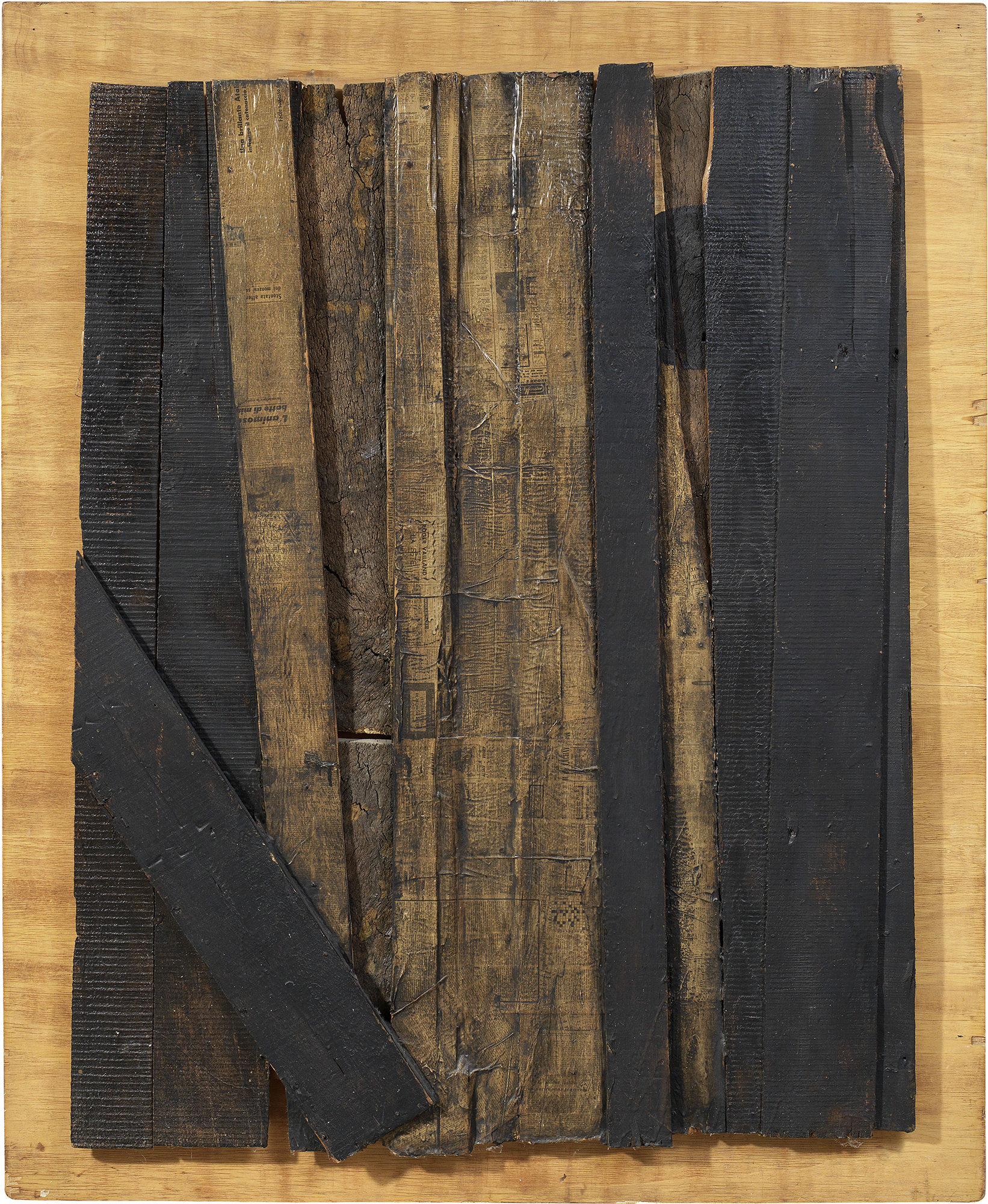 Legno, sughero e giornali su tavola, cm. 188,5x150,5