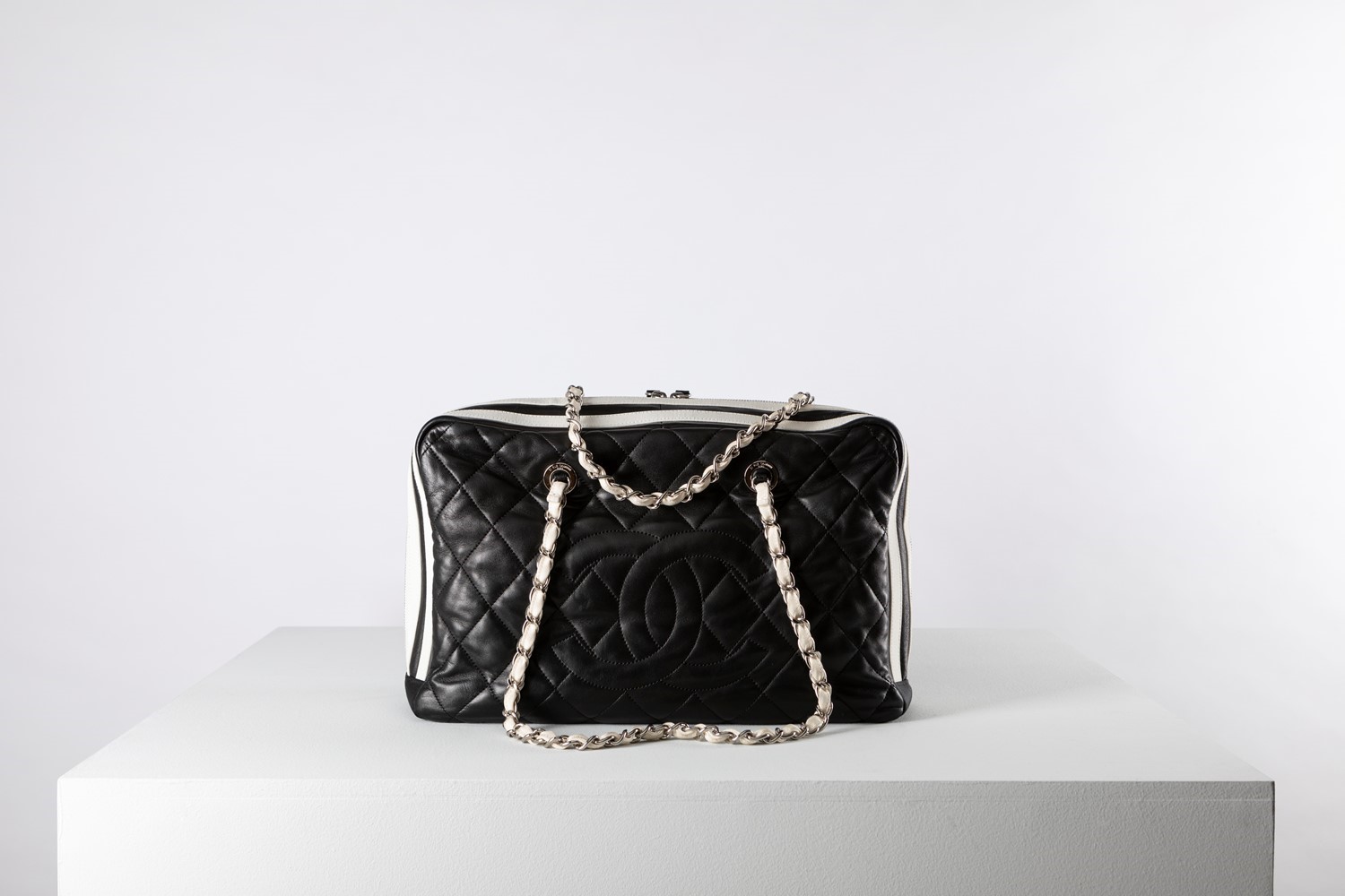 in pelle trapuntata color nero con inserti in tela color panna, doppia tracolla a catena, cm 40 x 15 x 23, con sacchetto (lievi difetti).