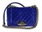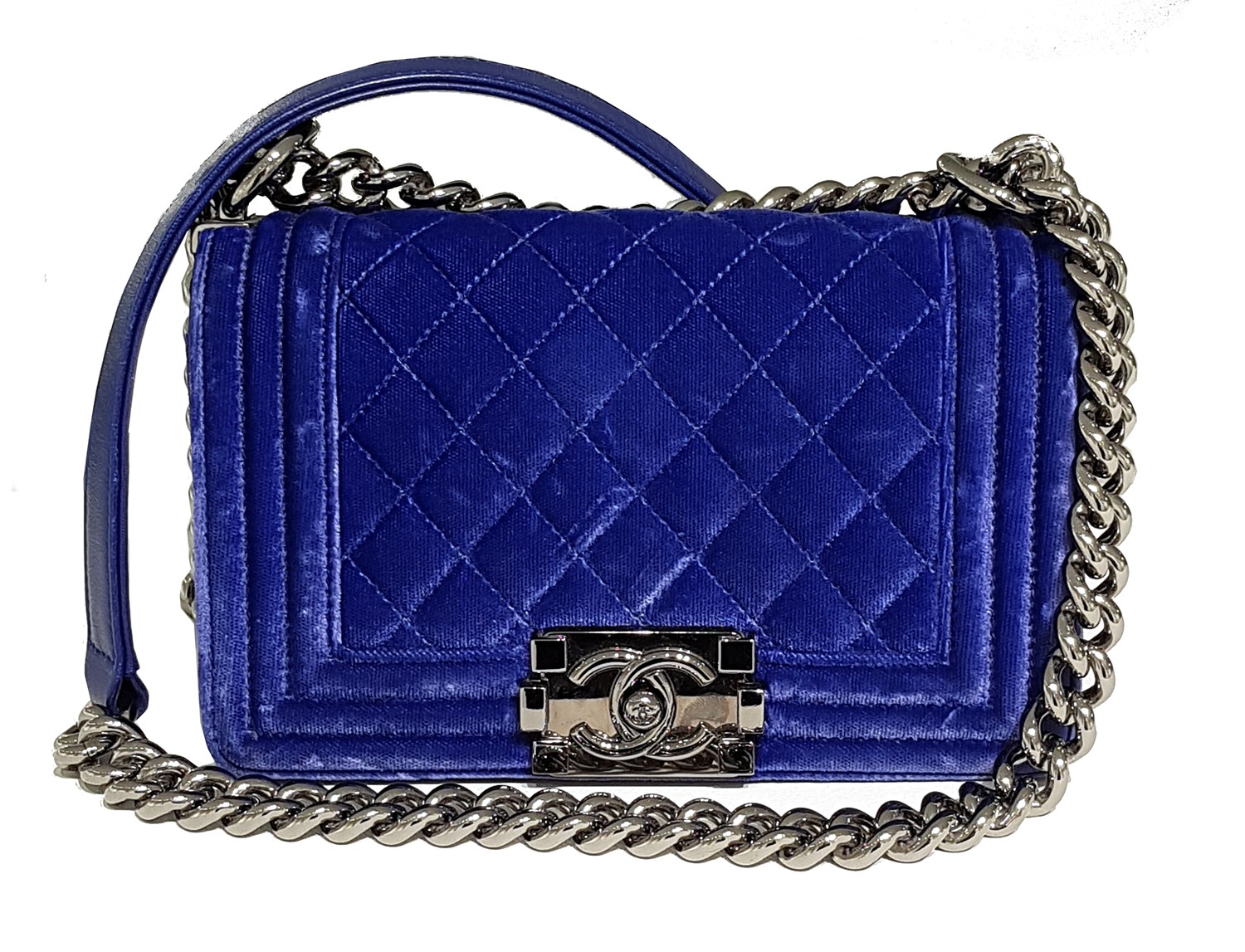 in velluto trapuntato color violetto, dettagli in metallo brunito, tracolla in pelle e a catena, con sacchetto (difetti).