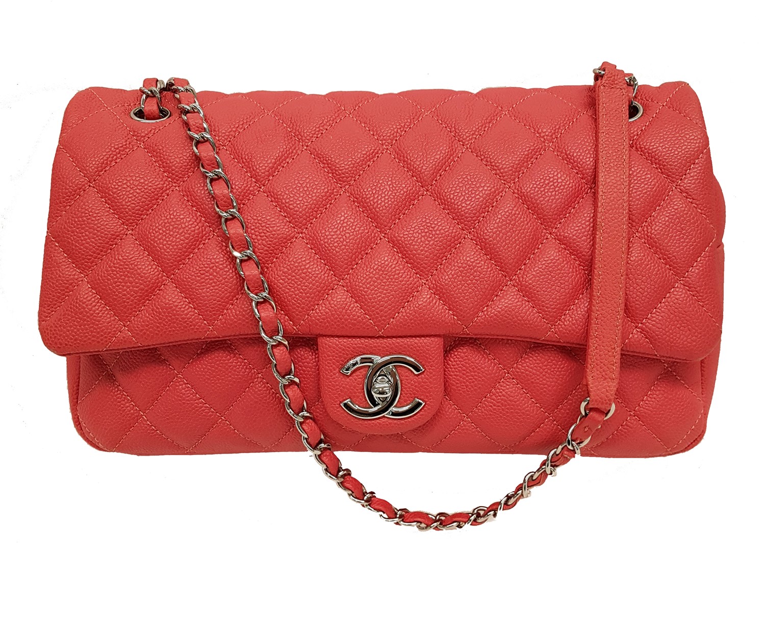 in pelle trapuntata caviar color fragola, tracolla a catena, cm 30, con sacchetto (lievi difetti).