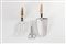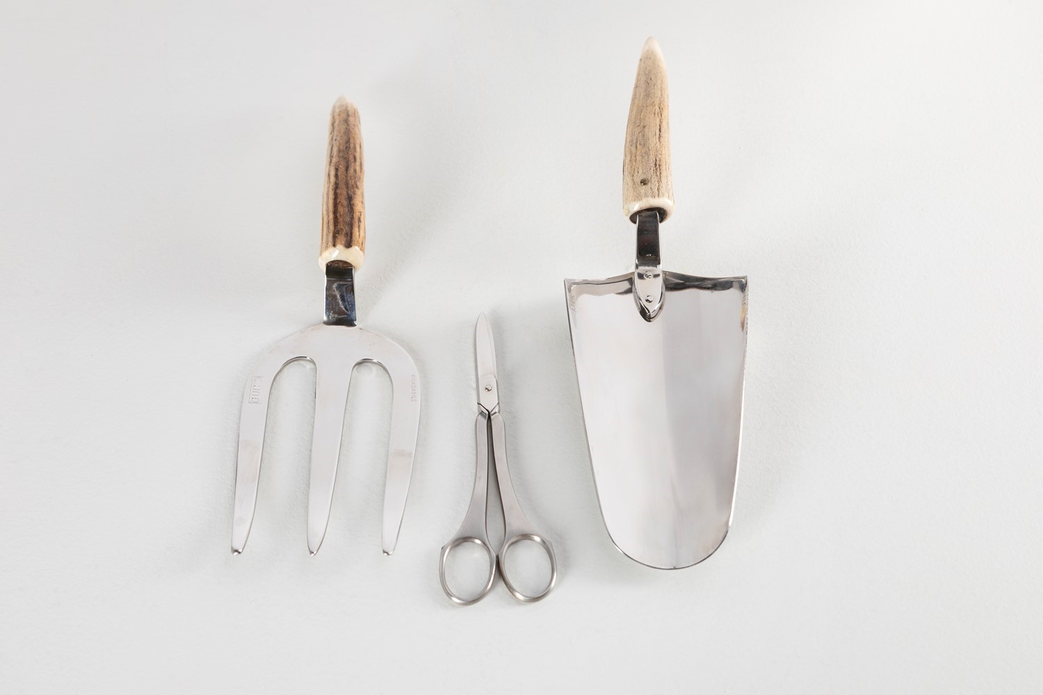 da portare in vita con cintura, in tessuto operato e stampato, profili in pelle di cinghiale color marrone, all'interno tre accessori in acciaio e corno, in confezione originale, anni '70, cm 46 x 40.