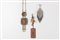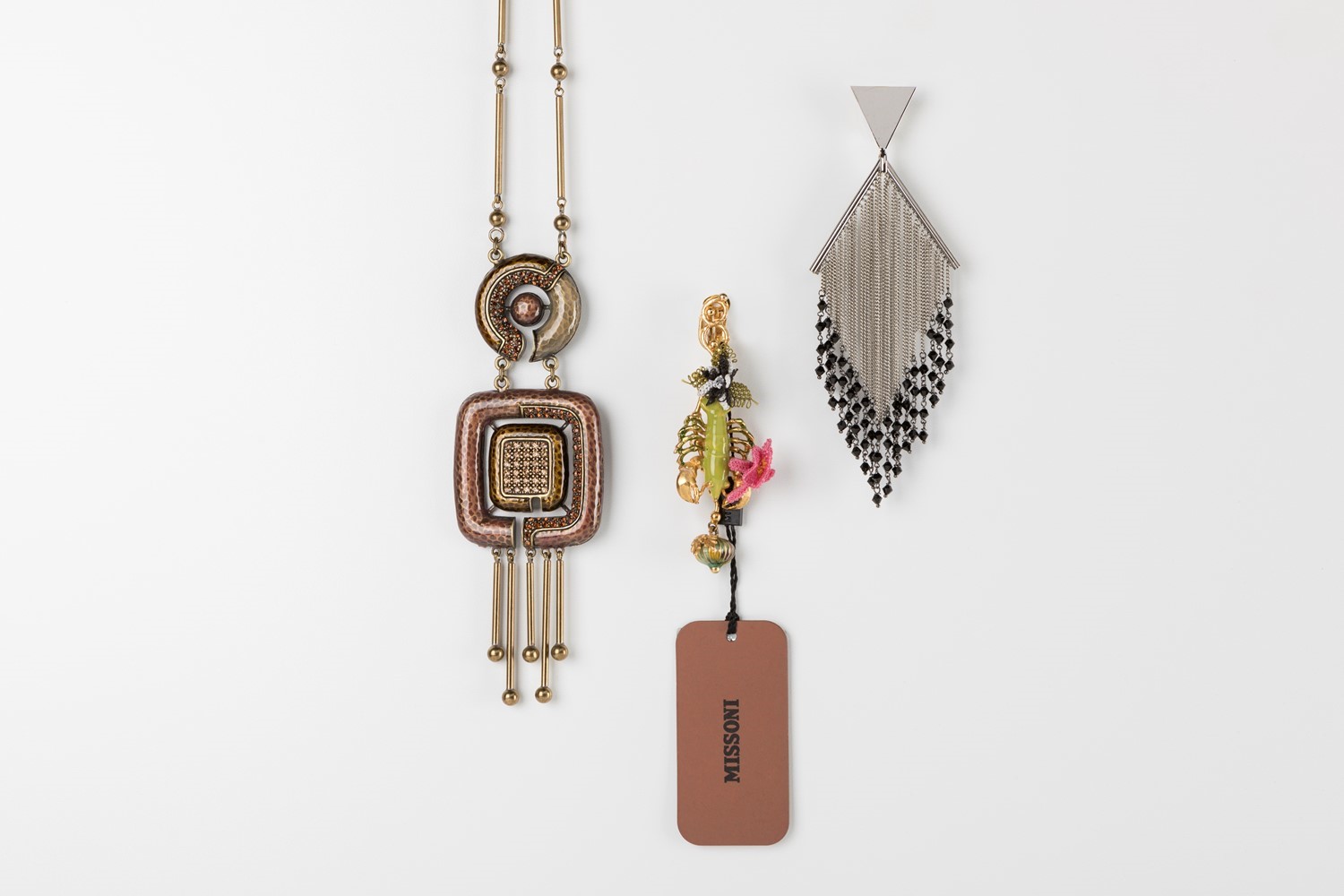 Lotto composto da un paio di orecchini pendenti con clip a lobo in metallo dorato, smalti e tessuto (cm 11), un paio di orecchini a foggia geometrica con clip a lobo e cascata di catenine in metallo (cm 17), e una lunga collana con grande decoro geometrico in strass e smalti di colori vari, cm 64, con scatole (lievi difetti).