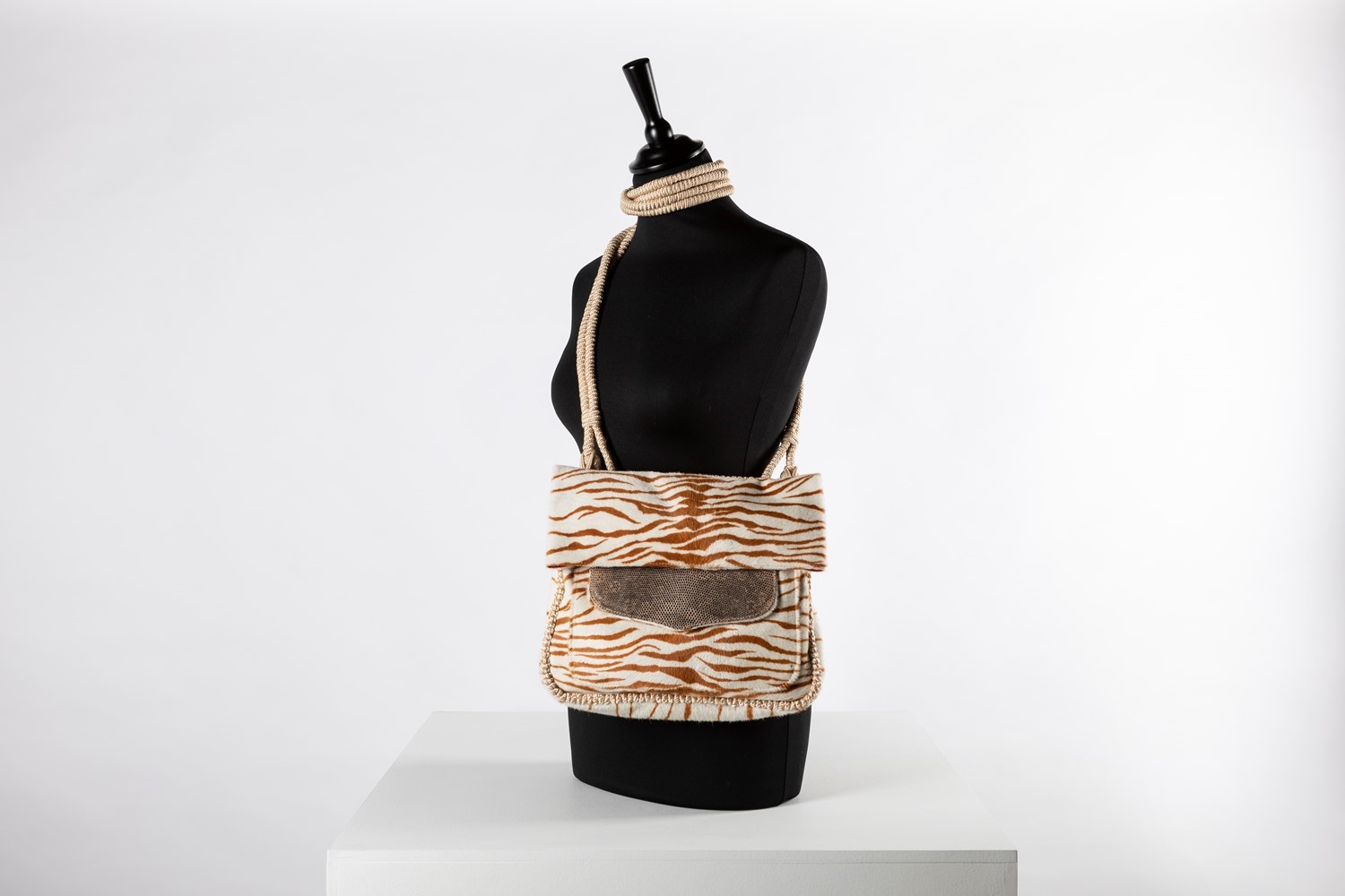 stampato bicolore, fodera in raso color rosso, tracolla in cordoncino, cm 30.