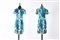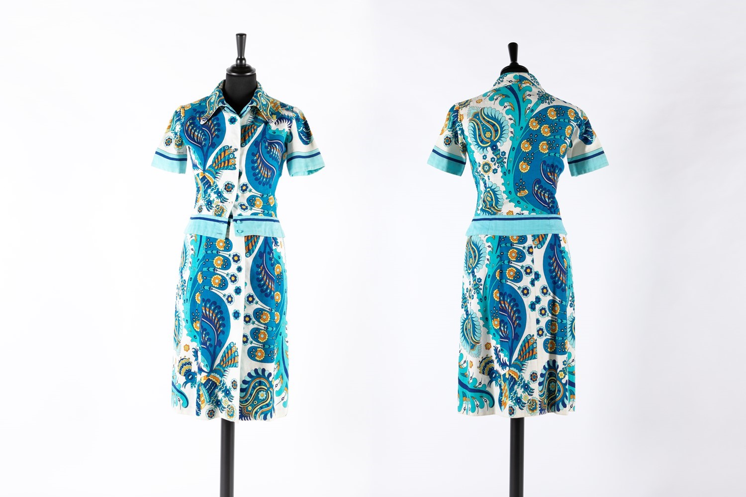 composto da gonna e top a manica corta in cotone color panna, stampa decoro Skiros, Julia Abadie, in tonalità blu e turchese, tg 40 (difetti), anni '70.