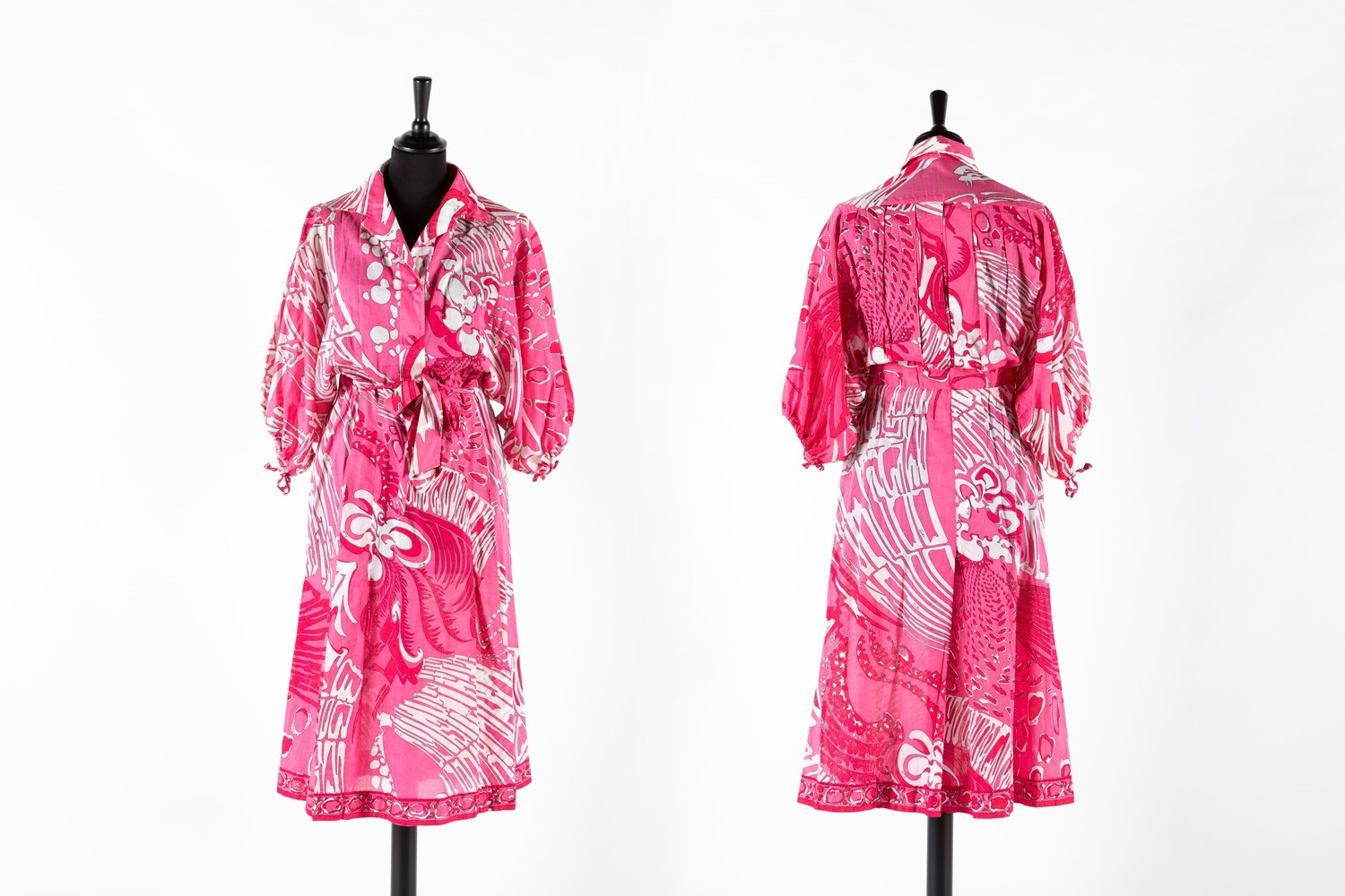 in cotone stampa fantasia color bianco e rosa fucsia, maniche a sbuffo, cintura in vita, tg 44 (lievi difetti).