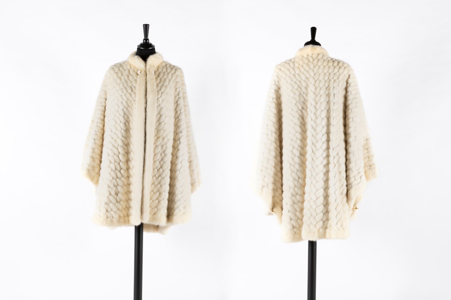 in pelliccia di visone color panna, motivo ad intarsio patchwork (difetti).