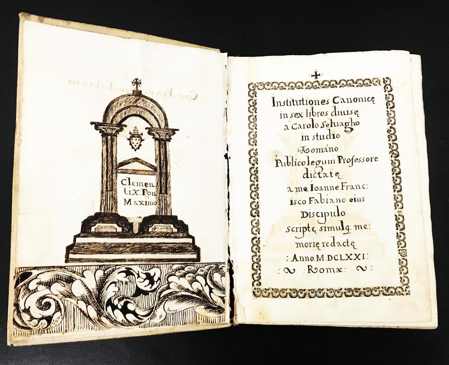 Institutiones Canonicae in sex libros divisae a Carolo Selvagho (?) in studio Romano Publico legume Professore dictatae a me Ioanne Francisco Fabiano eius Discipulo scriptae simul(que) memoriae redactae Anno MDCLXXI Romae.