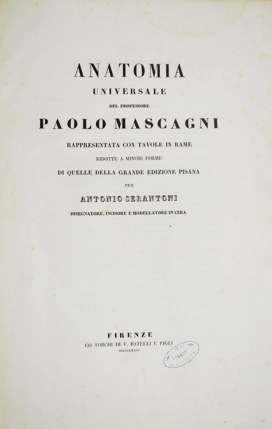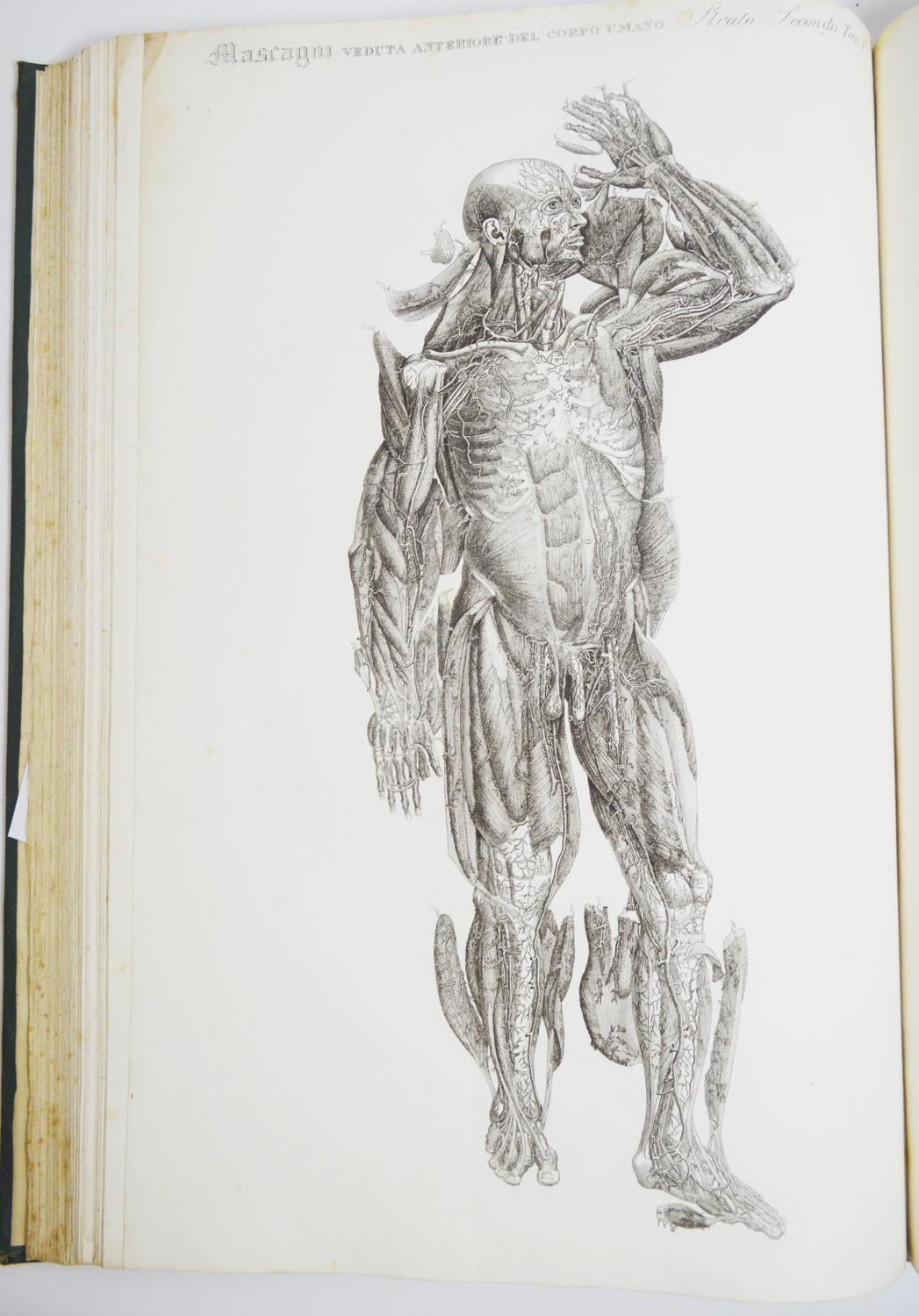 Firenze, Batelli Vincenzo, 1833. 2 voll. in folio, m. pelle coeva, filetti a secco e titolo in oro al dorso; pp. 292, (4) (totali + 150 incisioni complessive fuori testo). Opera monumentale che si deve al merito dell'artista Antonio Serantoni, responsabile del disegno e dell'incisione. Prima edizione italiana. La straordinaria precisione del dettaglio anatomico e la qualità artistica della coloritura resero questa edizione un punto di riferimento di grande importanza per gli studi anatomici e pittorici del XIX secolo. Impercettibile gora marginale su poche cc., qq. lieve rifioritura. Bell esemplare, ad ampi margini. Garrison-Morton, 409. Wellcome IV, p. 73. DSB, IX, 154.