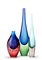 Lotto di due grandi vasi a collo stretto in vetro sommerso ametista/verde e zaffiro/erba, uniti a un vaso di manifattura muranese in vetro sommerso rubino/zaffiro con inclusione di grandi bolle. Murano, anni '60. (h cm 35,5; h cm 59,5; h cm 66,5) (lievi difetti)