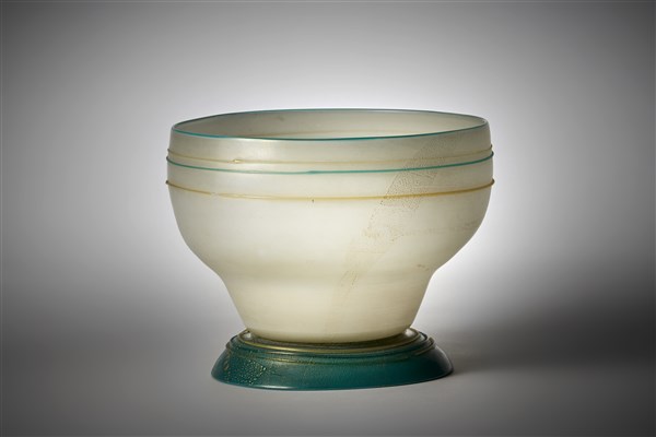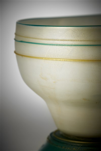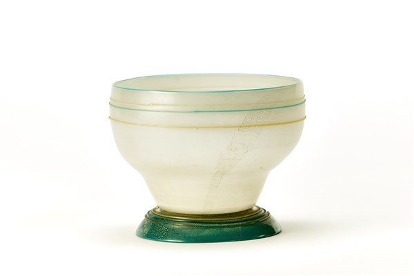 Vaso in vetro incamiciato lattimo e verde, con base a calotta applicata a caldo. Applicazione di foglia d'oro sulla superficie esterna e di sottili fili orizzontali in vetro verde e pagliesco attorno al corpo e alla base. Murano, 1930ca. Disegno n. 6038 del catalogo di fornace. (h cm 17; d cm 21) (lievi difetti)
