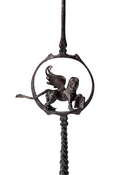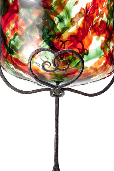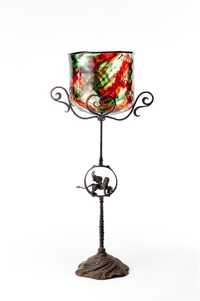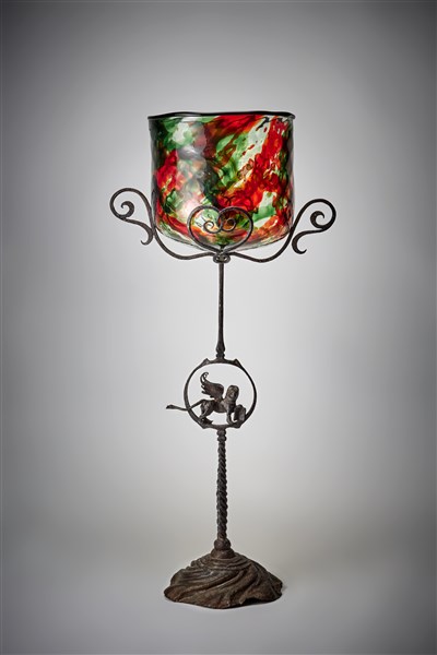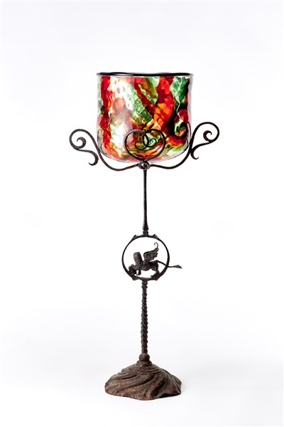 Vaso a caldaia in vetro soffiato trasparente incolore, verde, azzurro e rosso con leggera lavorazione a balloton e orlo superiore a toro in vetro nero applicato a caldo. Montatura in ferro battuto con base a calotta in lamina di ferro sbalzata con motivo spiraliforme, fusto a torciglione, pare centrale con leone di San Marco inscritto in tondo, terminazione sommitale a racemi ritorti. Esecuzione Vetreria Artistica Barovier, Venezia/Murano, 1924ca. (h vetro cm 22; d vetro cm 24; h totale cm 80) (lievi difetti al ferro)