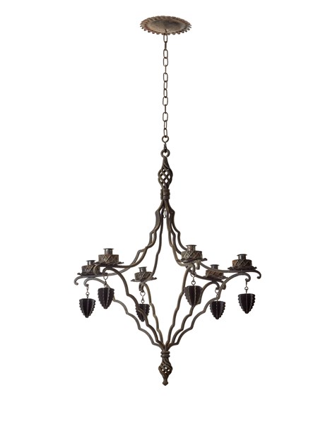 Lampadario in ferro battuto a sei luci, decorato con pendenti a forma di pigna geometrizzata. Venezia, 1923. Mancante del vetro centrale a cesendello. (h cm 140) (lievi difetti e mancanze)