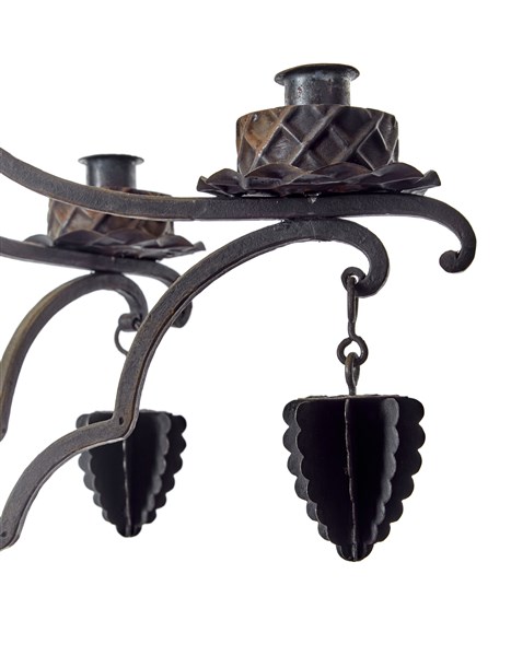 Wrought iron chandelier with six lights, decorated with pendants in the shape of a geometricized pine cone.. Venice, 1923. The central cesendello glass is missing. (h 140 cm.) (slight defects and losses)